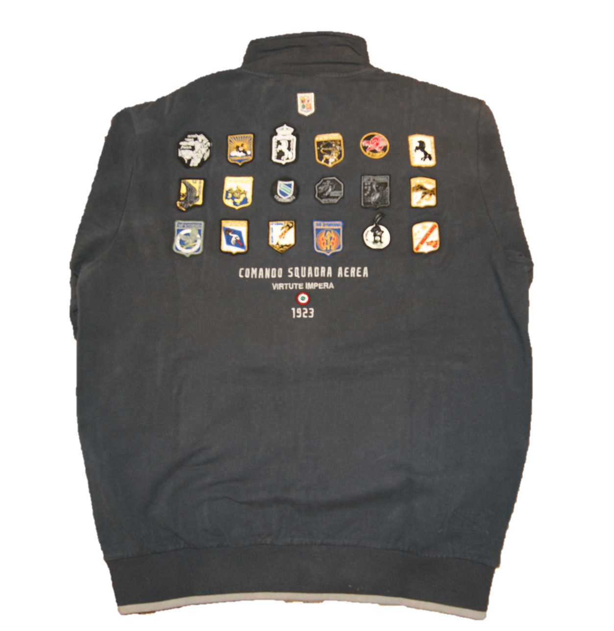DETAILS : VERSCHLUSS REISSVERSCHLUSS - AERONAUTICA MILITARE LOGO STICKEREI AUF DER BRUST - A.M. SCHRIFTZUG AM KRAGEN - 19 STICKER UND KLEINE STICKEREI AUF DEM RÜCKEN - BEIGE ABGESEZTE ARMBÜNDCHEN & STRICKBUND - 2 SEITLICHE EINGRIFFSTASCHEN .