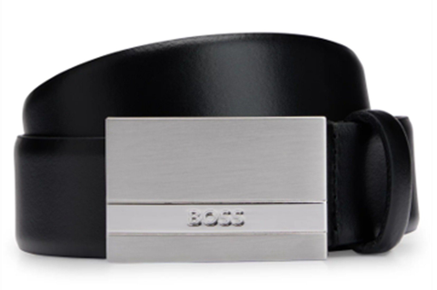 DIESER GÜRTEL VON BOSS MIT DEM NAMEN BAXTON . MODERNER GÜRTEL MIT EINER MATTEN METALL SCHLIESSE MIT KLEINER BOSS LOGO PRÄGUNG .