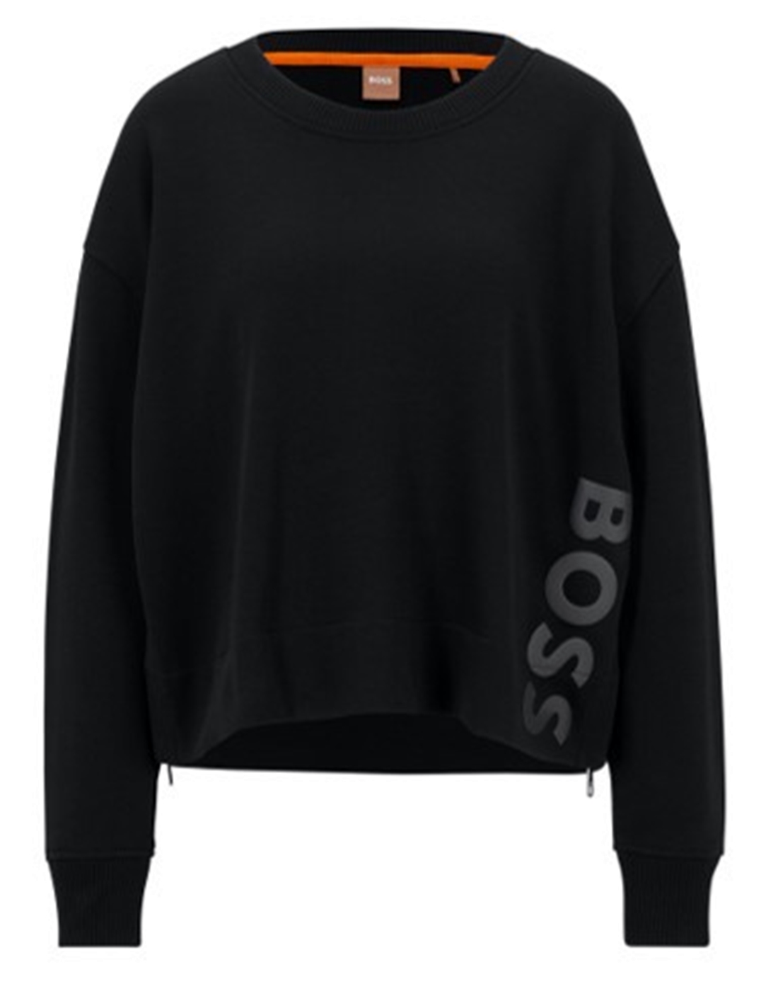 Ein Sweatshirt aus reicher Baumwolle mit Reißverschlüssen an den Seitennähten und einem dekorativen, reflektierenden Logo von BOSS Womenswear. Für unsere RESPONSIBLE Produkte verwenden wir immer mindestens 60 % nachhaltigere Rohstoffe. Dieses Produkt ist aus zertifizierter Bio-Baumwolle hergestellt. Beim biologischen Baumwollanbau wird auf den Einsatz von synthetischen Düngemitteln, Pestiziden und gentechnisch verändertem Saatgut verzichtet.