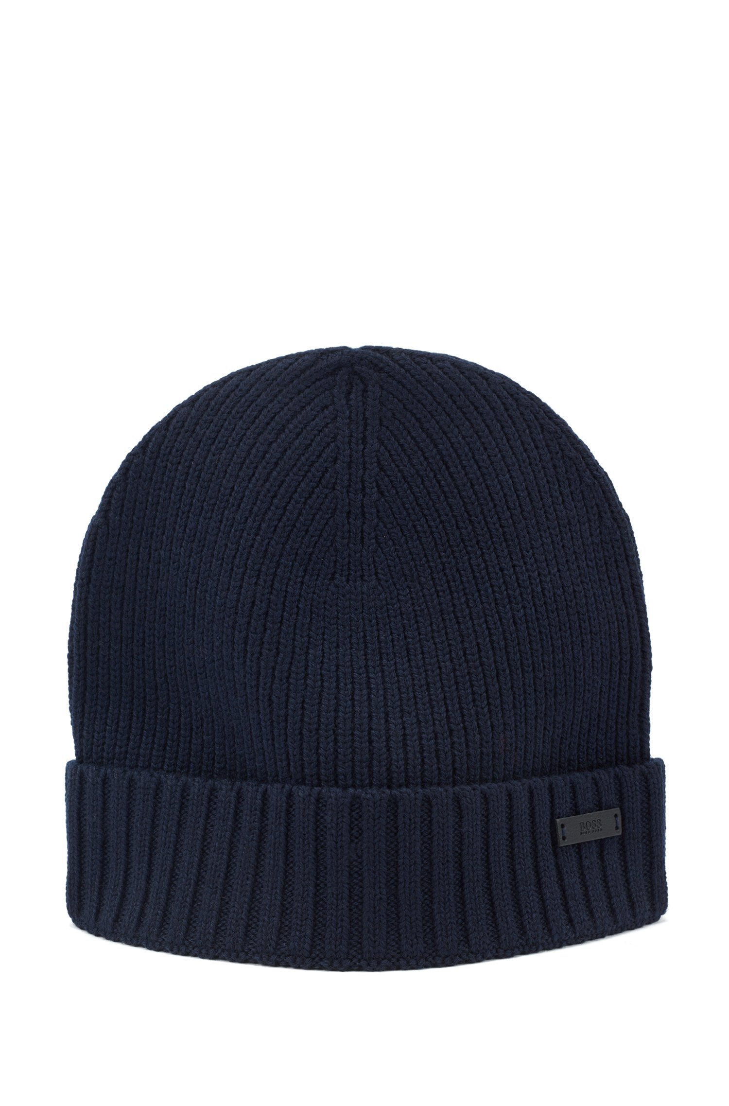 DIESE MÜTZE VON HUGO BOSS MIT DEM NAMEN FATI-B . KOMFORTABLE HUGO BOSS STRICKMÜTZE AUS REINER WOLLE MIT RIPPSTRUCKTUR UND UMGESCHLAGENEM SAUM SOWIE BOSS METALLENE LOGO AUFNÄHER .