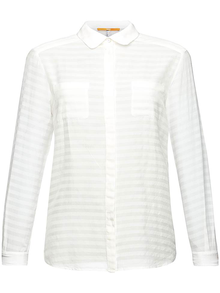 DIESE BOSS ORANGE BLUSE MIT DEM NAMEN EJEY_1 IST EINE ZART FALLENDE BLUSE AUS TRANSPERENTER SEIDE; DIE MIT DEZENTEN STREIFEN DURCHWIRKT IST.