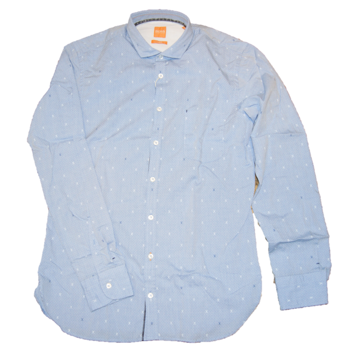 DIESES SHIRT VON BOSS ORANGE MIT DEM NAMEN CATTITUDE .SCHMAL GESCHNITTENES MUSTER SHIRT MIT KLEINEM HAIFISCHKRAGEN .