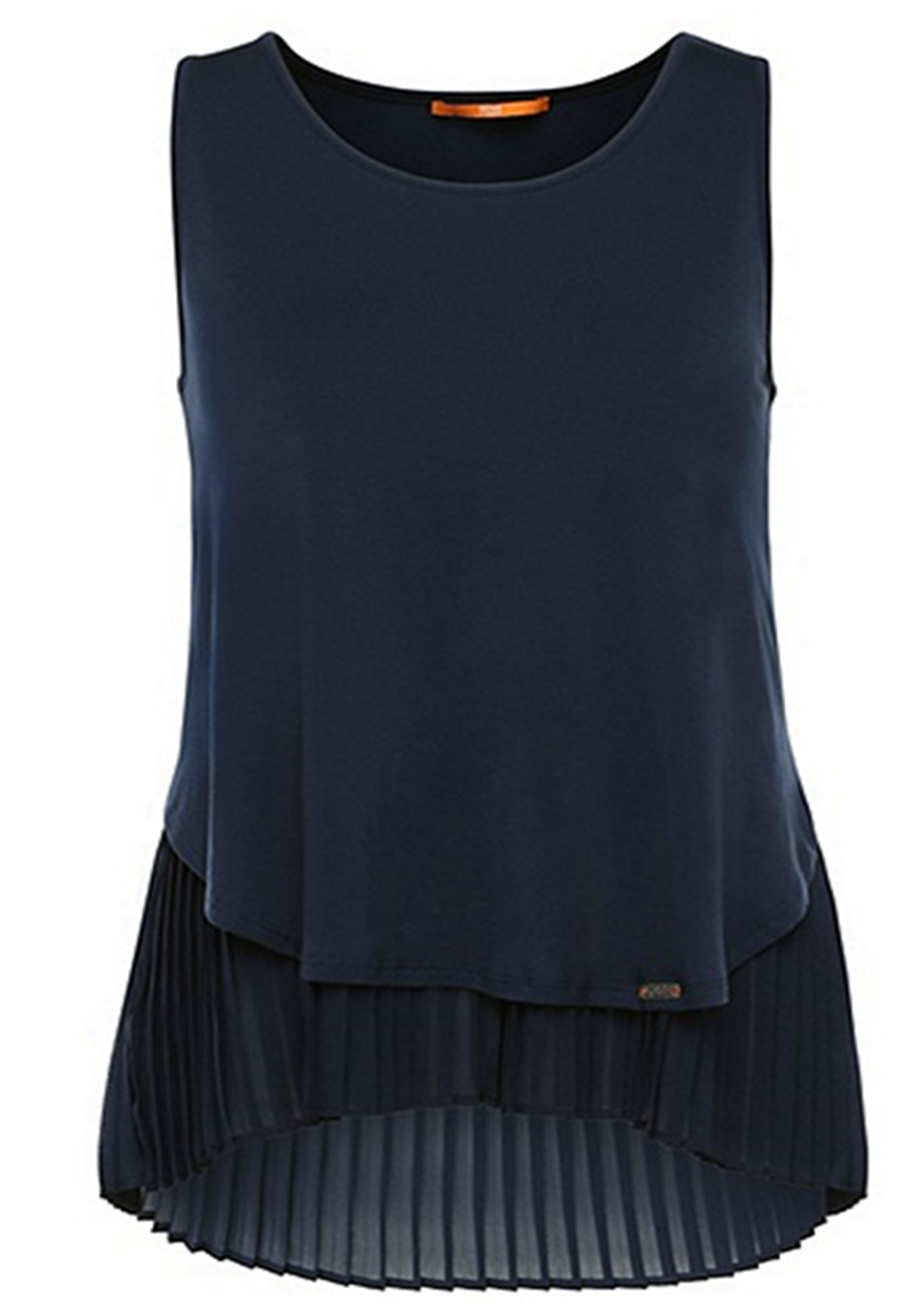 DIESES TOP VON BOSS ORANGE MIT DEM NAMEN TOPI . UNIFARBENES REGULAR FIT TOP AUS EINER WEICHEN POLYESTER FASER IM LAYERING LOOK MIT PLISSEE FALTEN .