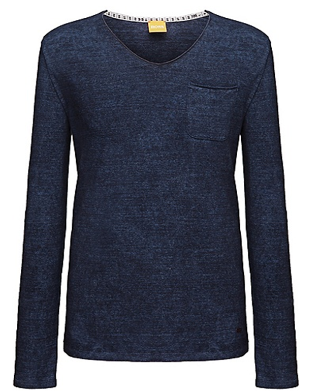 DIESES LANGARM TEE SHIRT VON BOSS ORANGE MIT DEM NAMEN TALBOTT . WEICHE BAUMWOLLE MIT USED FÄRBUNG IST DAS THEMA .DER V AUSSCHNITT UND DER WEITERE FASHION FIT STYLE GEBEN HIER DEN TON AN .