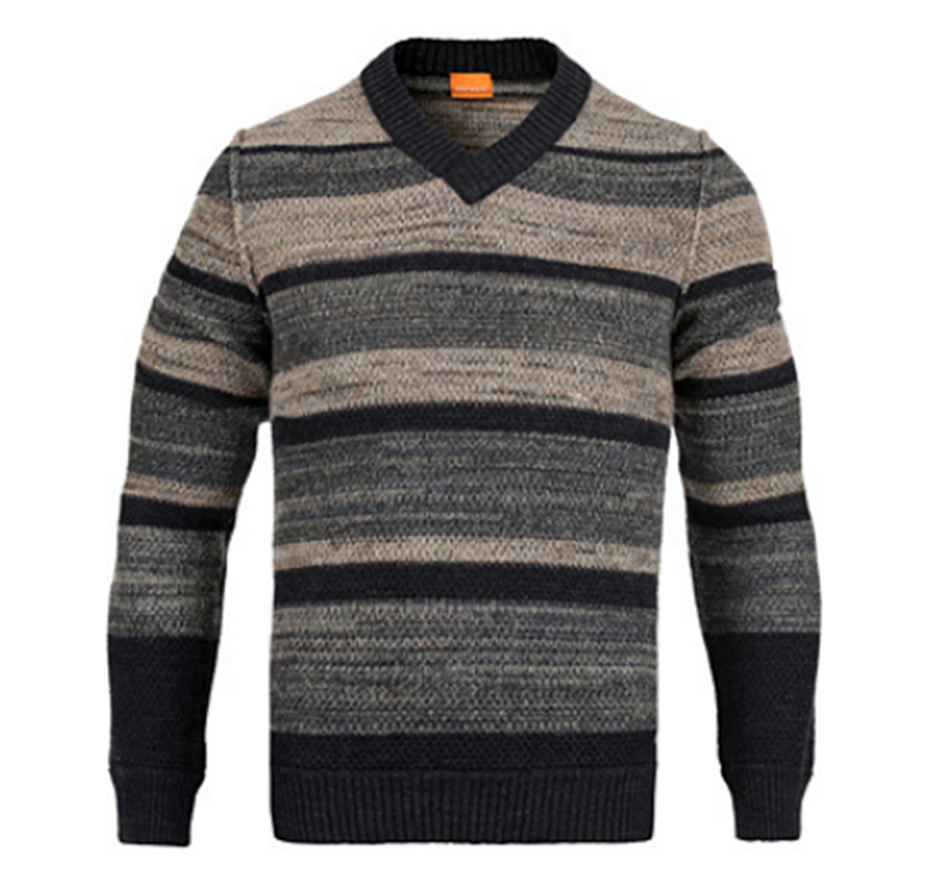 DIESER PULLOVER VON BOSS ORANGE MIT DEM NAMEN KANYE SCHMALL GESCHNITTENER PULLI MIT V AUSSCHNITT UND GESTREIFTEN STRICKMUSTER MIT GROBSTRICKMASCHEN .