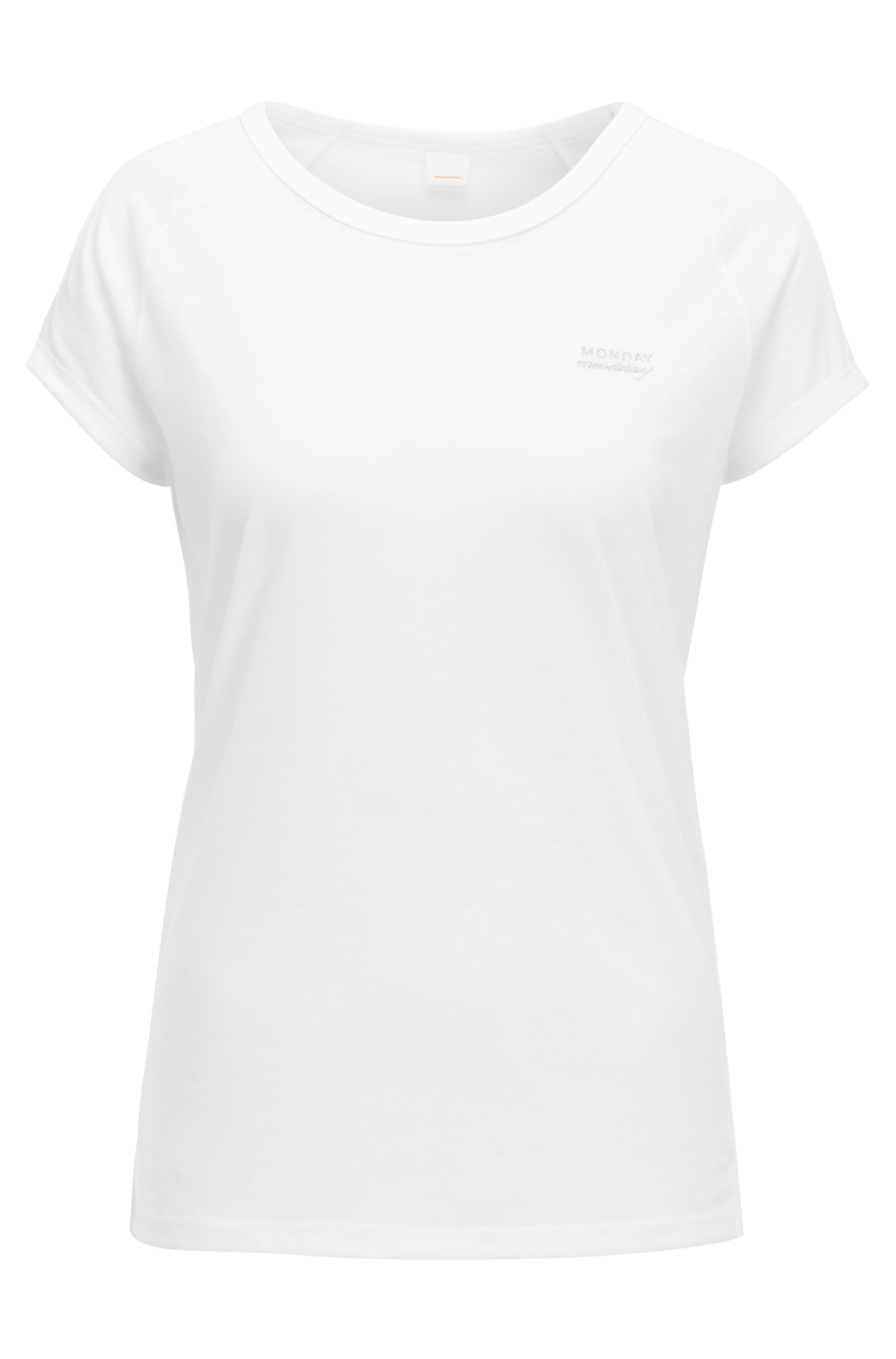 DIESES TEE SHIRT VON BOSS ORANGE MIT DEM NAMEN TEEDAY , LÄSSIGES RUNDHALSAUSSCHNITT SHIRT AUS EINER WEICHEN POLYESTER VISKOSE MISCHUNG MIT STICKEREI AUF DER BRUST ,