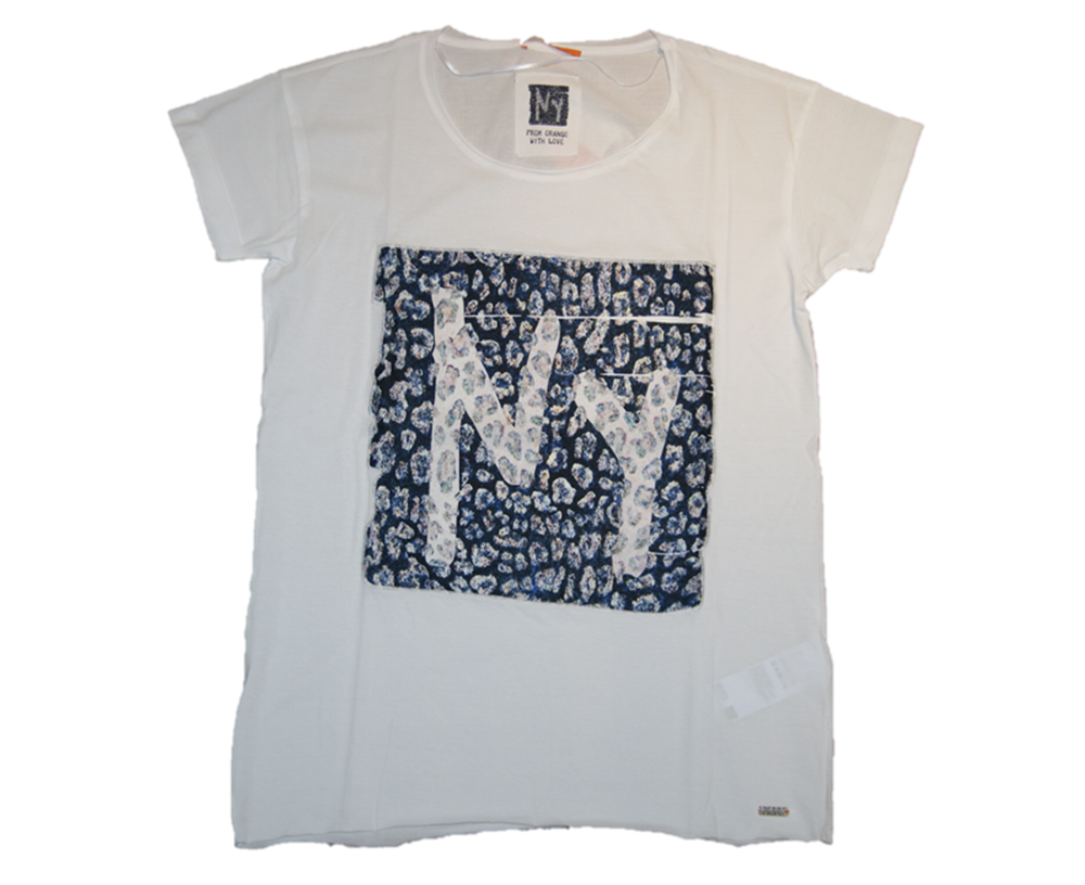 DIESES BOSS ORANGE T-SHIRT MIT DEM NAMEN TALMAYA. UNIFARBENES WEISSES T-SHIRT MIT APPLIKATION IN RECHTECK-FORM NY STEHT FÜR NEW YORK IN BLAUEN PATCHWORK-STYLE. FROM ORANGE WITH LOVE.