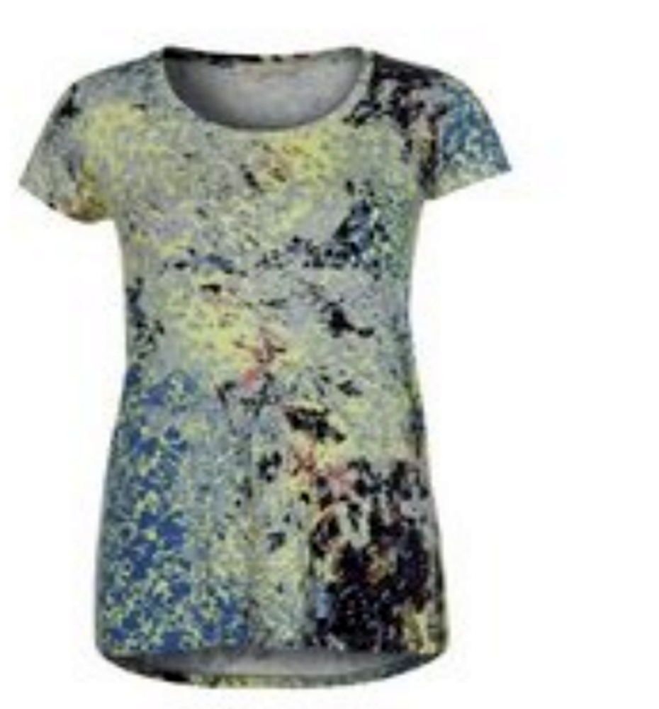 DETAILS: MARMORIERTER PRINT, AUSGESTELLTER SAUM, RUNDAUSSCHNITT, LOGO; UNTEN AM SAUM (LINKS)