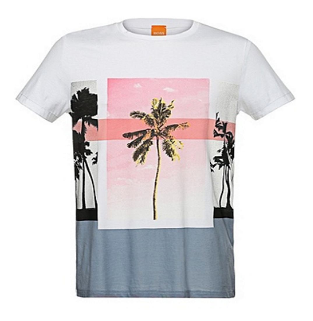 DIESES TEE SHIRT VON BOSS ORANGE MIT DEM NAMEN TOWNEY 4 . MODISCH GESCHNITTENES AUS WEICHER BAUMWOLLE SHIRT MIT EINEM SOMMMERLICHEN PALMEN MOTIV WELCHES ZU JEDEM OUTFIT PASST .