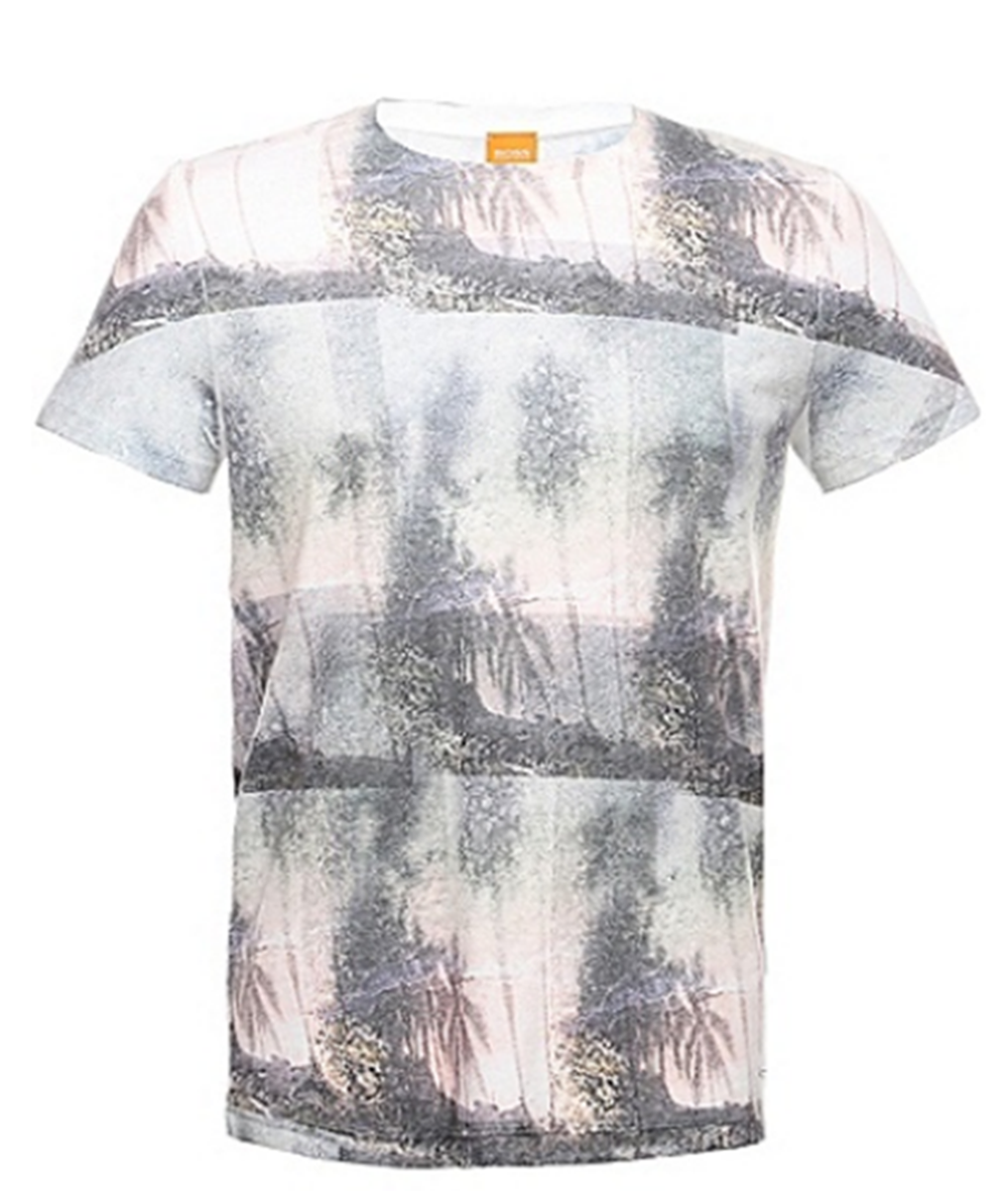 DIESES TEE SHIRT VON BOSS ORANGE MIT DEM NAMEN TULIPO . DER SOMMER KANN KOMMEN MIT DIESEM TEE SHIRT .VERWASCHENER PALMEN PRINT IM USED LOOK .