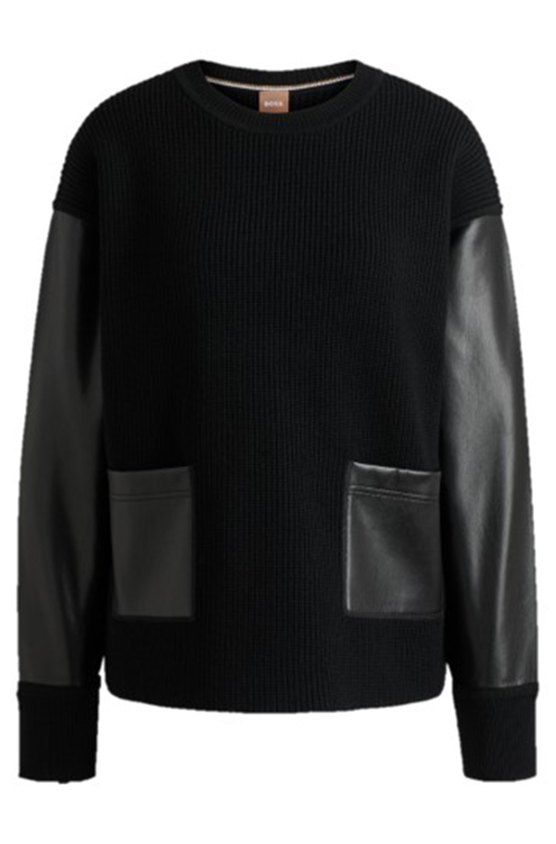 Boss Pullover Fanalian aus Schurwolle mit Kunstlederärmeln schwarz 001