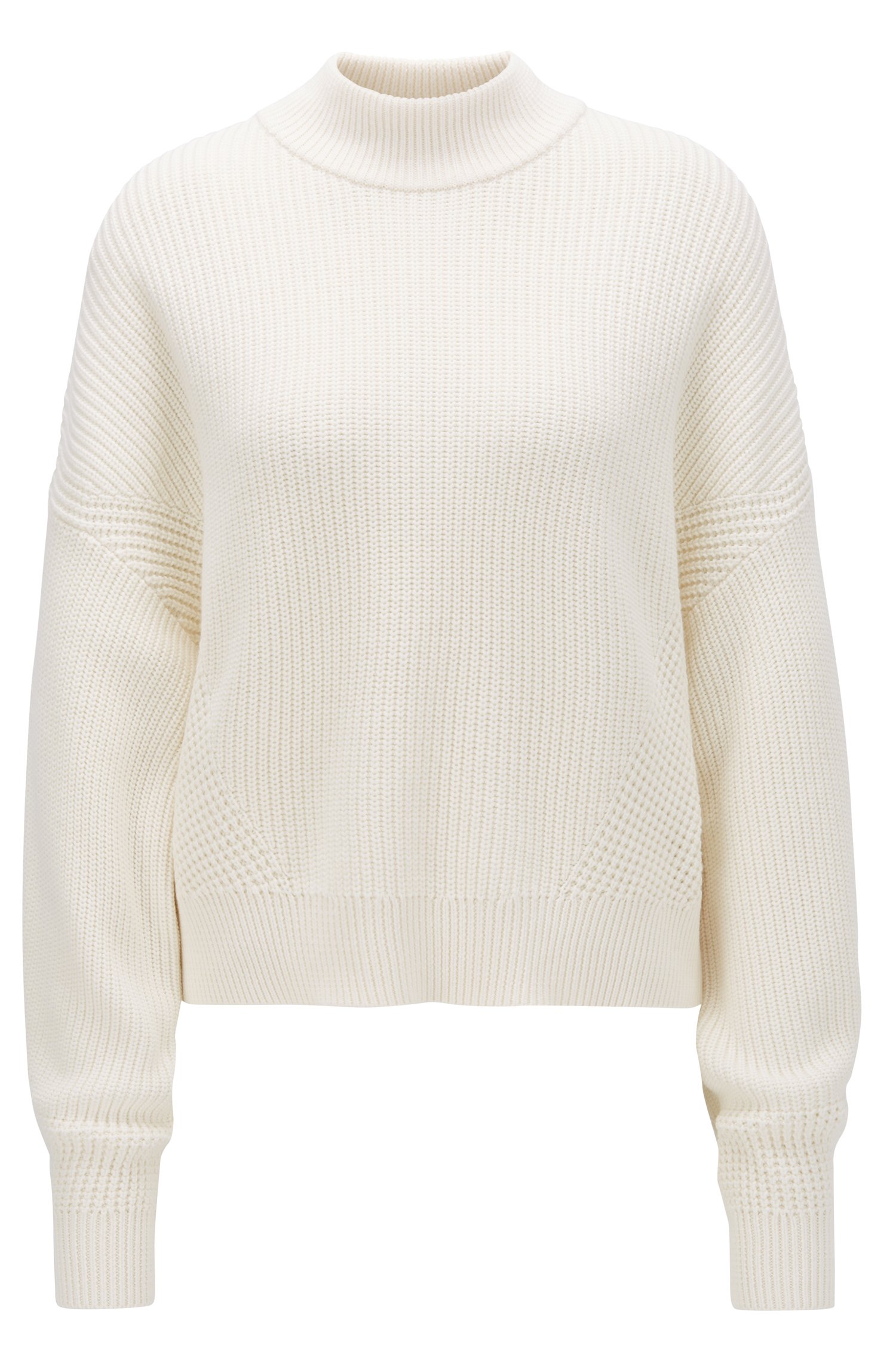 DIESER PULLOVER VON HUGO BOSS MIT DEM NAMEN LSMENI .WEISCHER REGULAR FIT STRICKPULLOVER MIT EINEM DIAGNOALEN RIPP STRICK MUSTER STEHKRAGEN UND KÜRZER GESCHNITTENER SILHOUETTE.