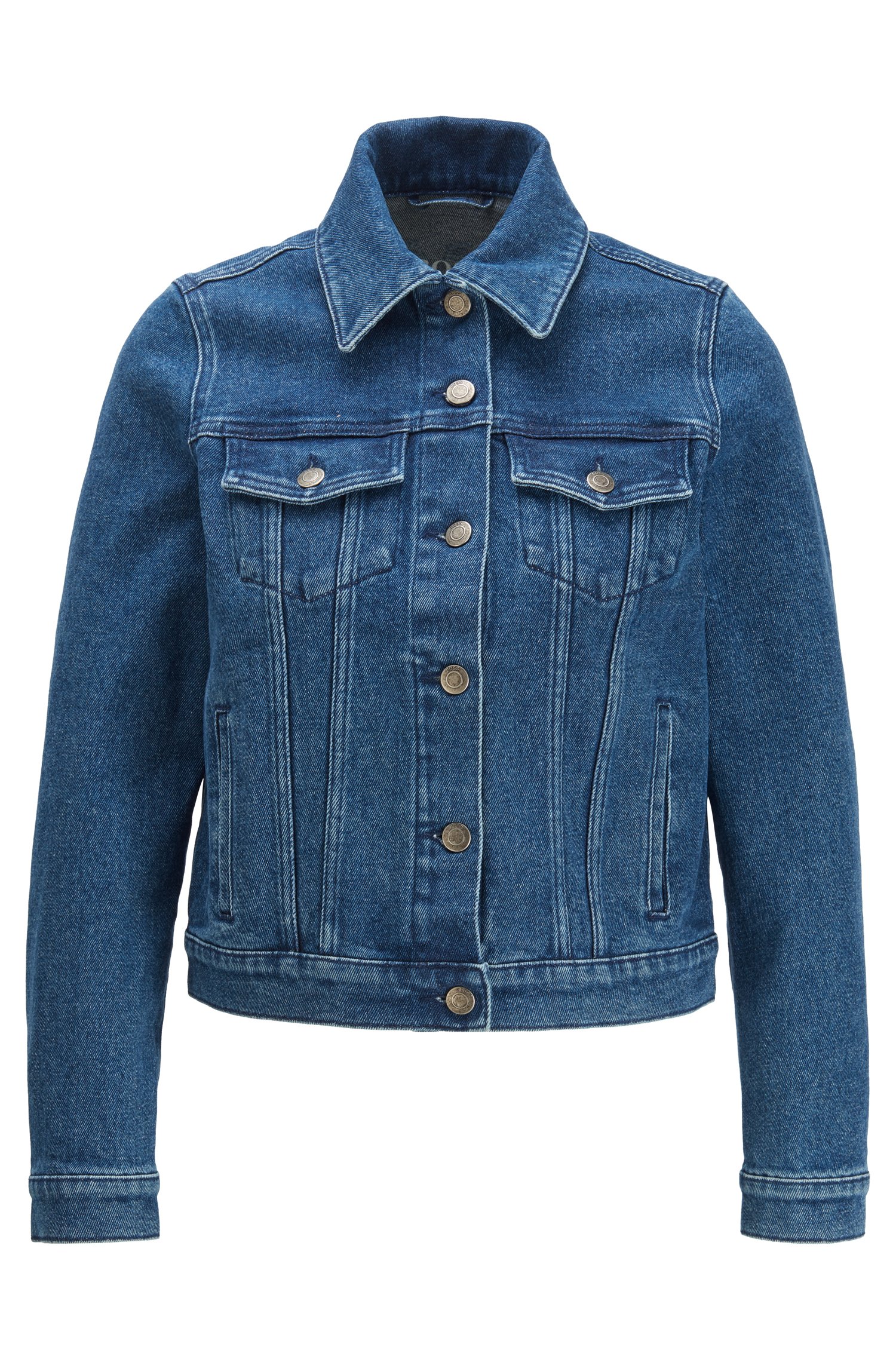 DIESE JEANSJACKE VON HUGO BOSS MIT DEM NAMEN J90 COMPTON . SPORTLICHE DAMEN REGULAR FIT JEANSJACKE AUS ELASTISCHER BAUMWOLLE MIT BOSS LOGO AUF DER RÜCKENPASSE .