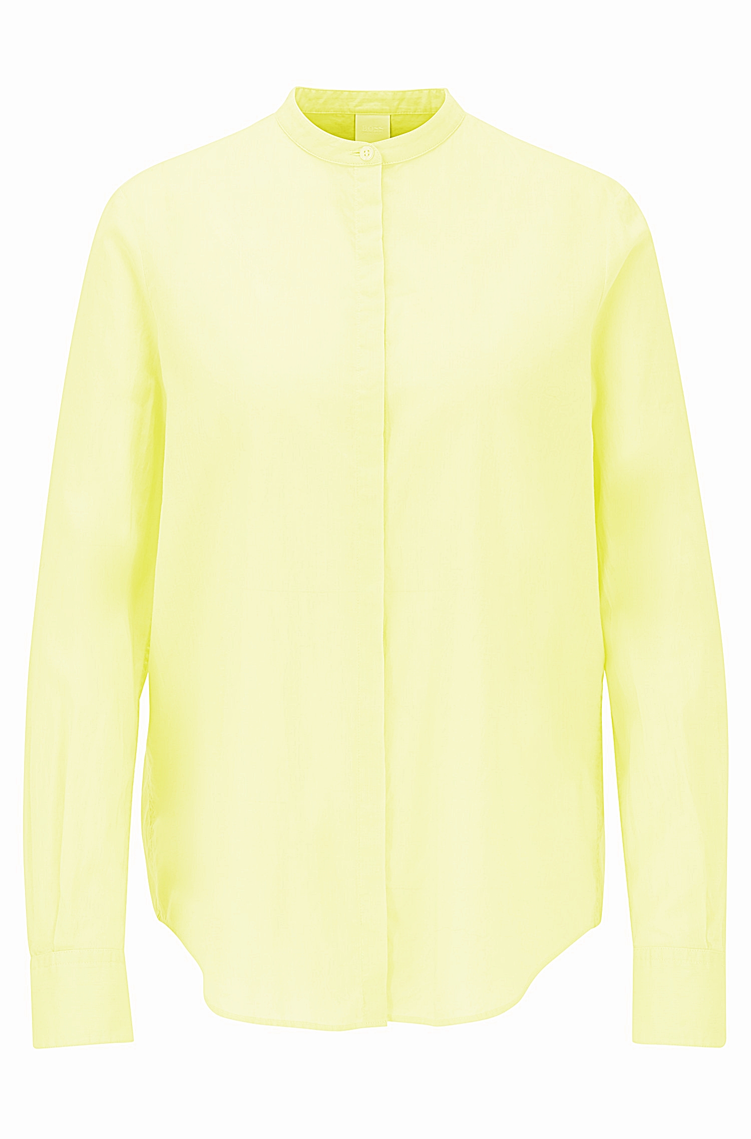 DIESE BLUSE VON HUGO BOSS MIT DEM NAMEN EFELZIE_17 . LOCKER GESCHNITTENE DAMEN BLUSE AUS EINER GEWASCHENEN BAUMWOLL QUALITÄT MIT STEHKRAGEN .