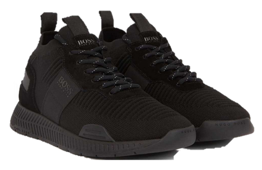 DIESER SNEAKERS VON HUGO BOSS MIT DEM NAMEN TITANIUM_RUNN_KNST. SPORTLICHER SNEAKER AUS NAPPALEDER MIT FUNKTIONALEN ELEMENTEN AUS EINEM MATERIAL MIX MIT SEITLICHEM BOSS MONOGRAMM .