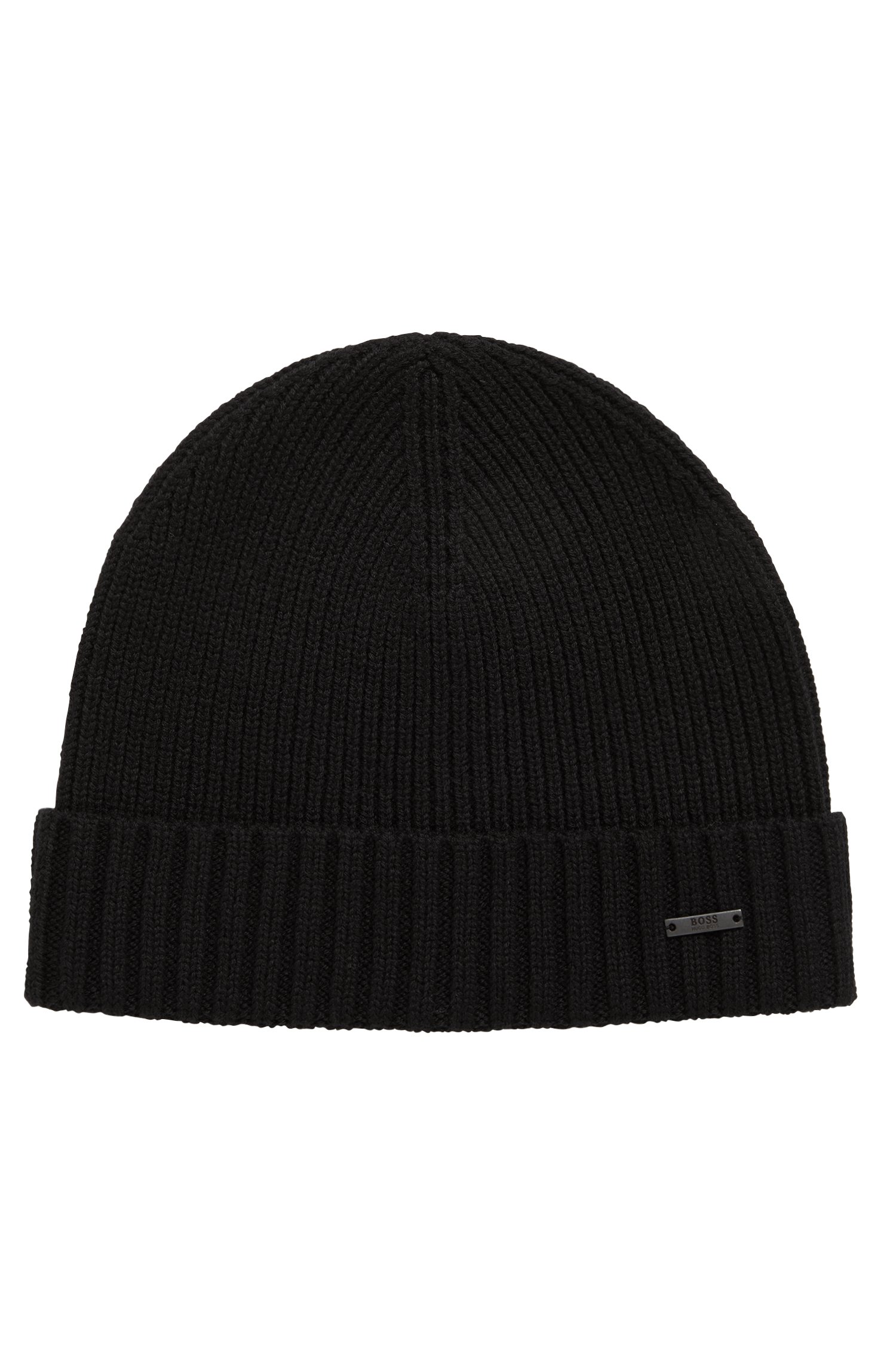 BOSS Strickmütze Fati 03 aus Schurwolle mit metallener Logo-Applikation schwarz 001