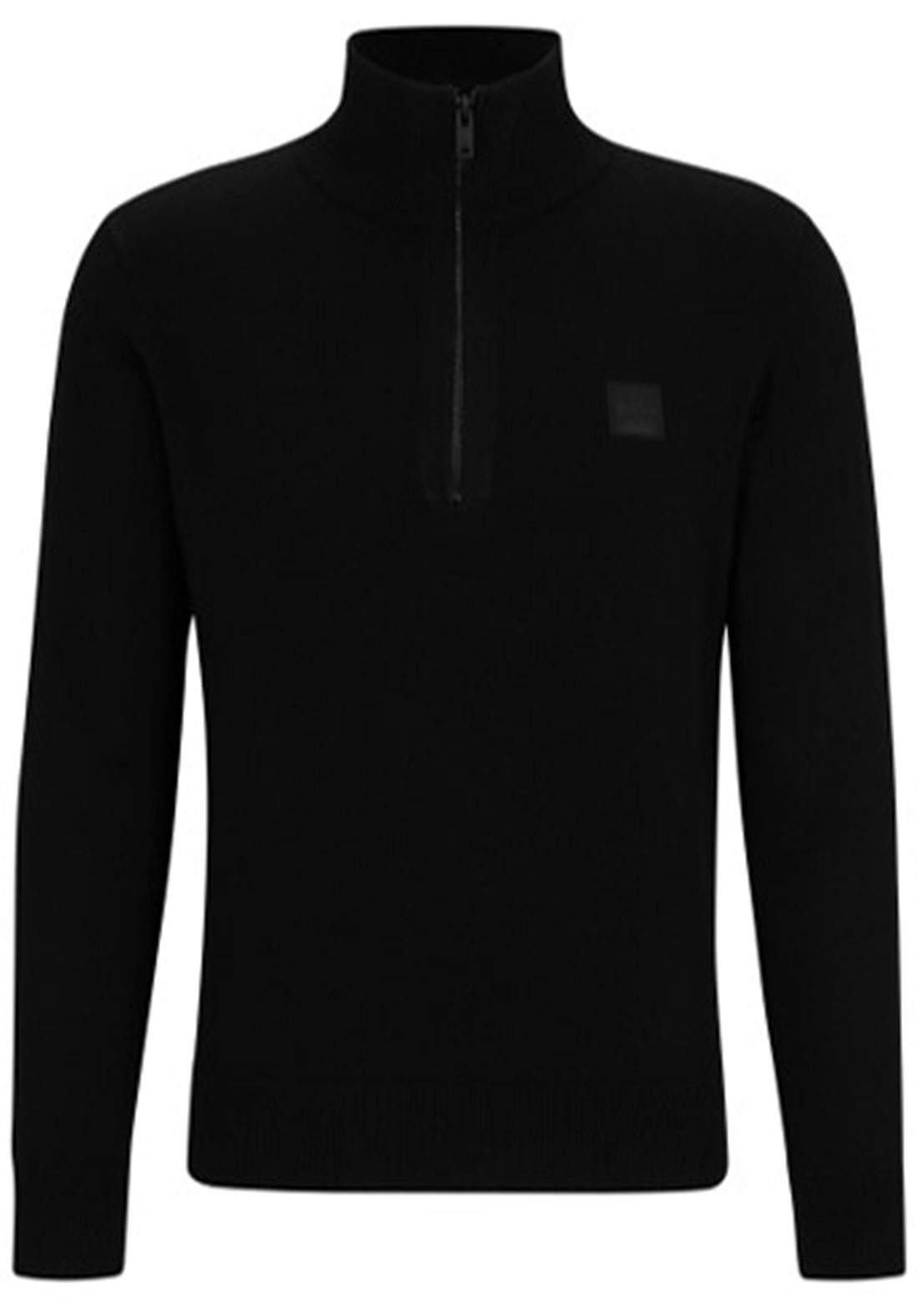 Gerade geschnittener BOSS Pullover aus einem Baumwoll-Mix mit Kaschmir-Anteil. Ein Troyerkragen und ein gewebter Logo-Aufnäher kennzeichnen das Design.