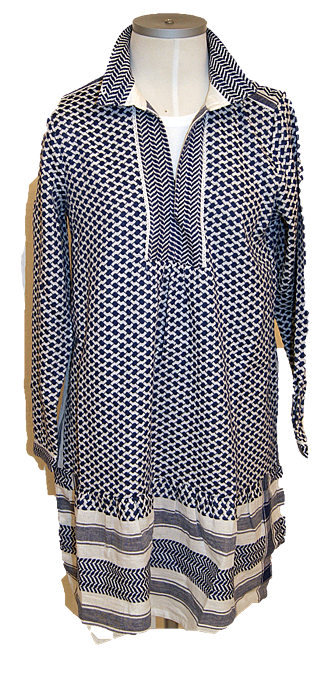 DIESES KLEID VON CECILIE COPENHAGEN MIT DEM NAMEN LYNETTE DRESS .EINFACHES ÜBERZIEHKLEID MIT 3/4ARM POLOKRAGEN UND V AUSSCHNITT IN BLAU IM KUFIYAMUSTER HANDGEWEBT .