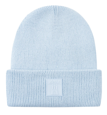 Coole Mütze in Hellblau mit edlem Ton-in-Ton Derbe-Logo und aus extra weichem und veganem Polylana Garn.