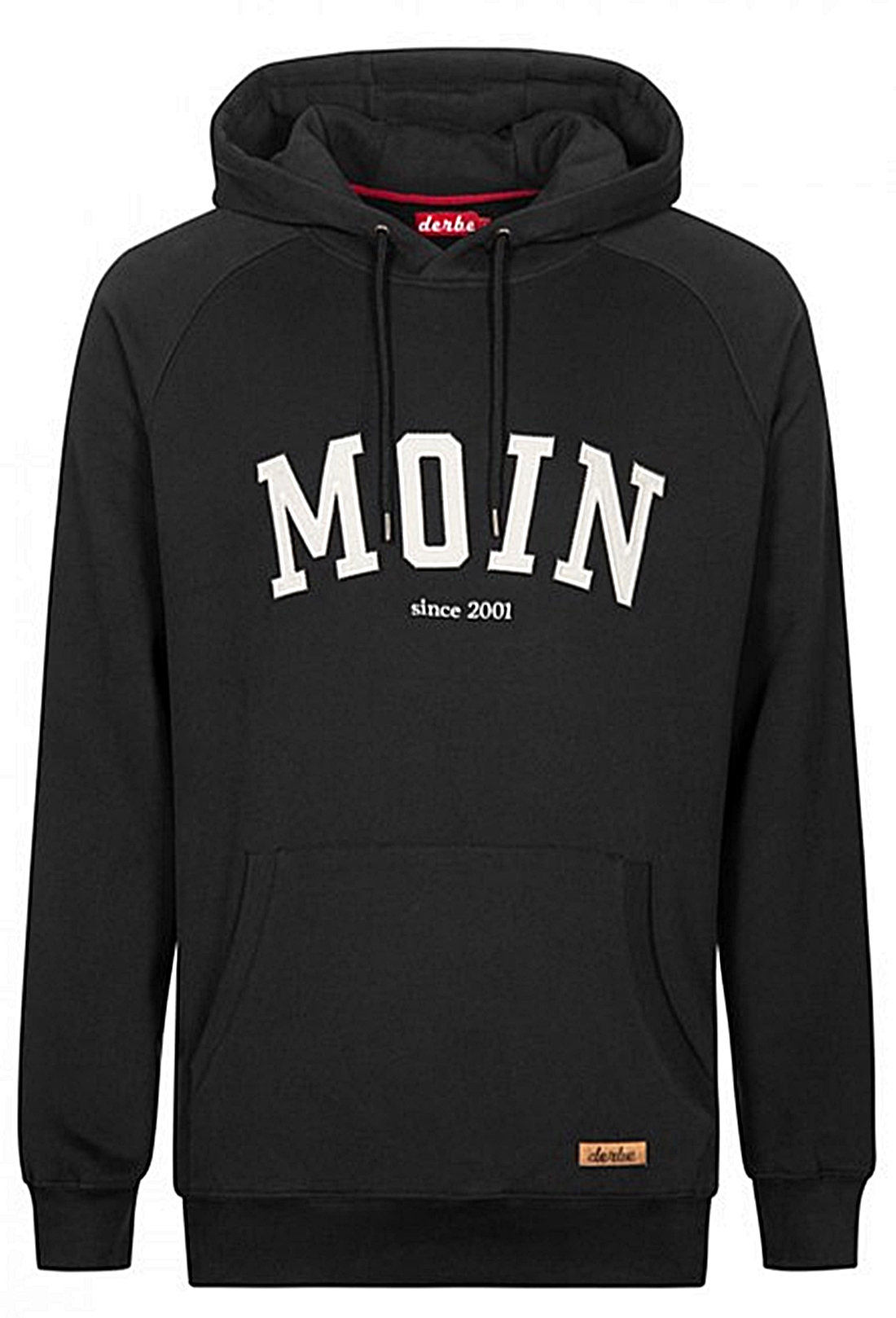 Lässiges Kapuzensweat Shirt für Herren in schwarz mit zwei seitlichen Einschubtaschen und Derbe Logo am Bund sowie  MOIN SINCE 2001 Schriftzug auf der Brust Tunnelzugbänder an der Kapuze- VIELEN DANK DERBE