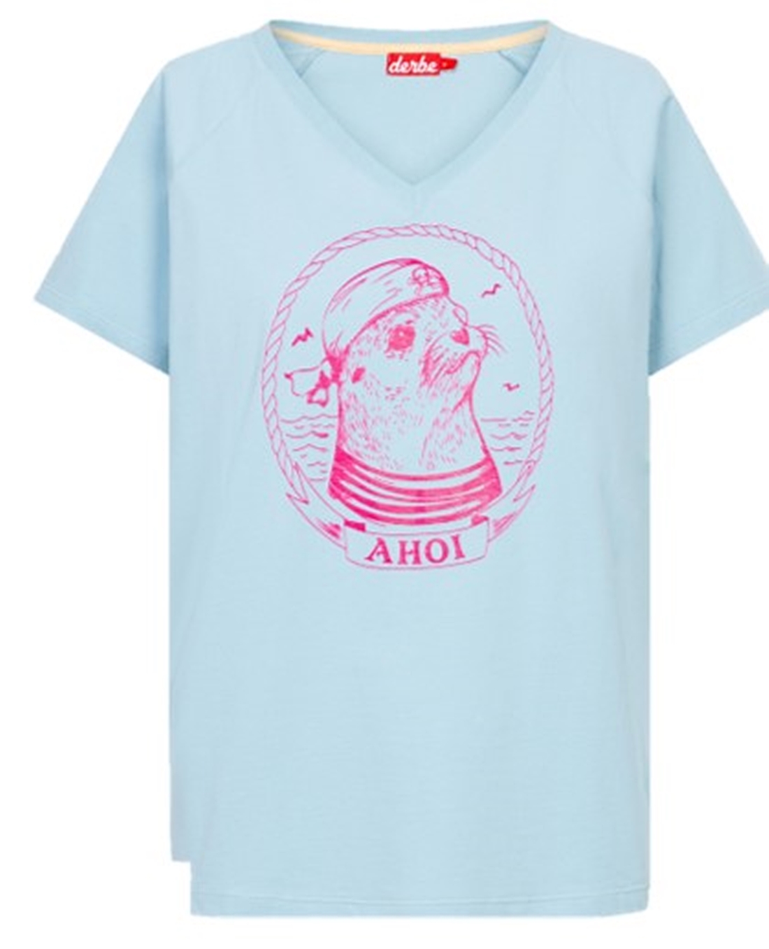 Hellblaues Derbe T-Shirt für Damen mit coolem Matrosen Robben Motiv in Pink. Ahoi ihr Landratten - Handgezeichnet zum Verlieben!