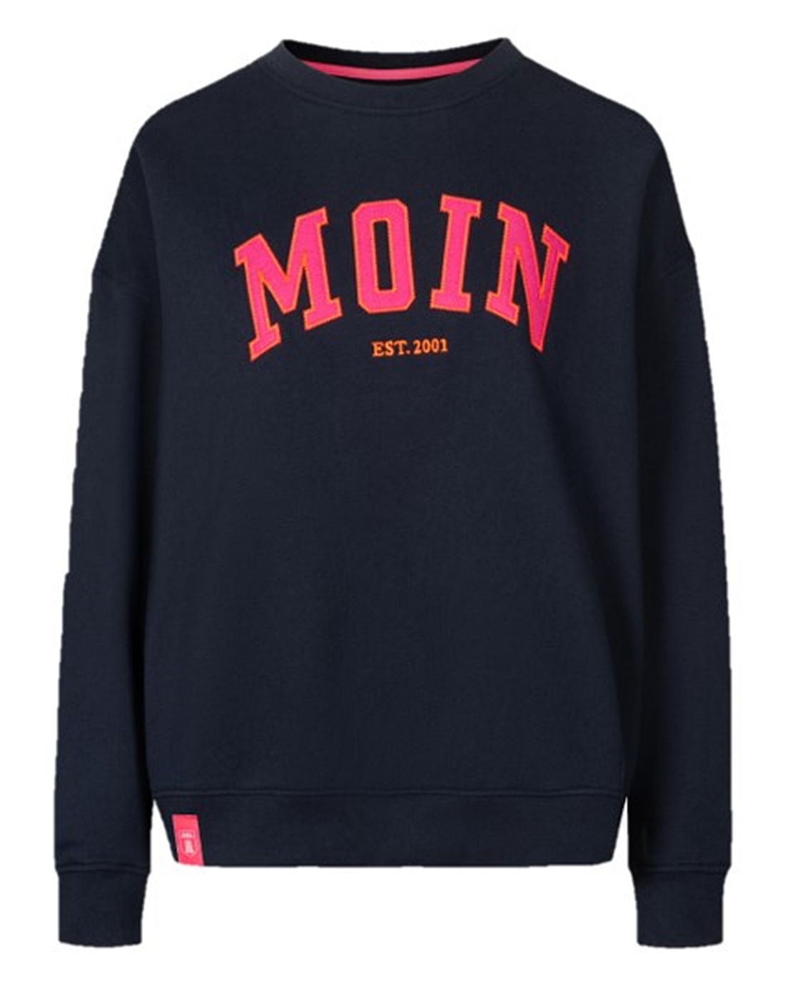 Dunkelblaues Damen Sweatshirt mit aufgesetztem Moin-Schriftzug in Kontrastfarben. Die Akzente sind in Orange und Pink gehalten.