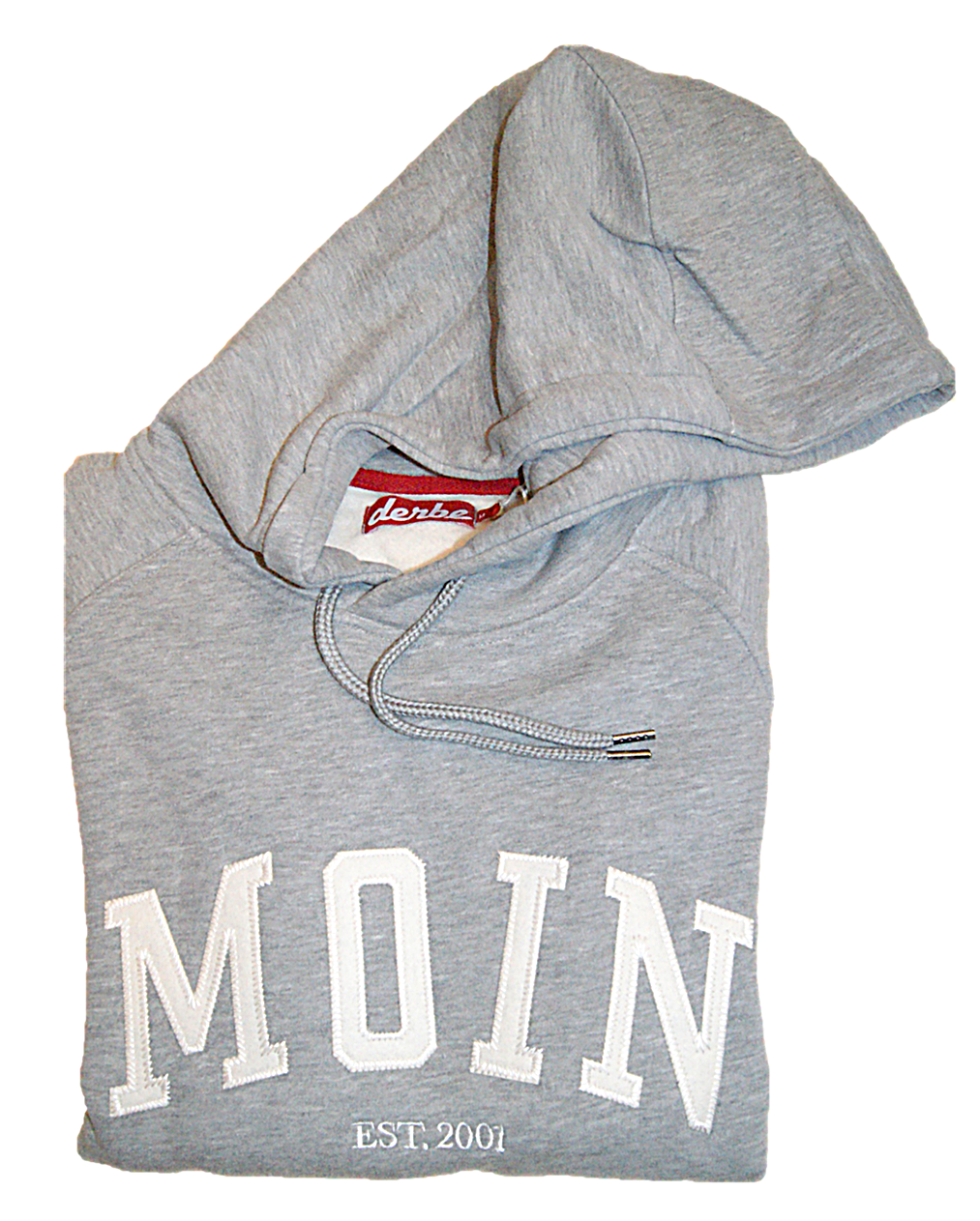 Lässiges Kapuzensweat Shirt für Herren in blau mit zwei seitlichen Einschubtaschen und Derbe Logo am Bund sowie MOIN SINCE 2001 Schriftzug auf der Brust Tunnelzugbänder an der Kapuze- VIELEN DANK DERBE