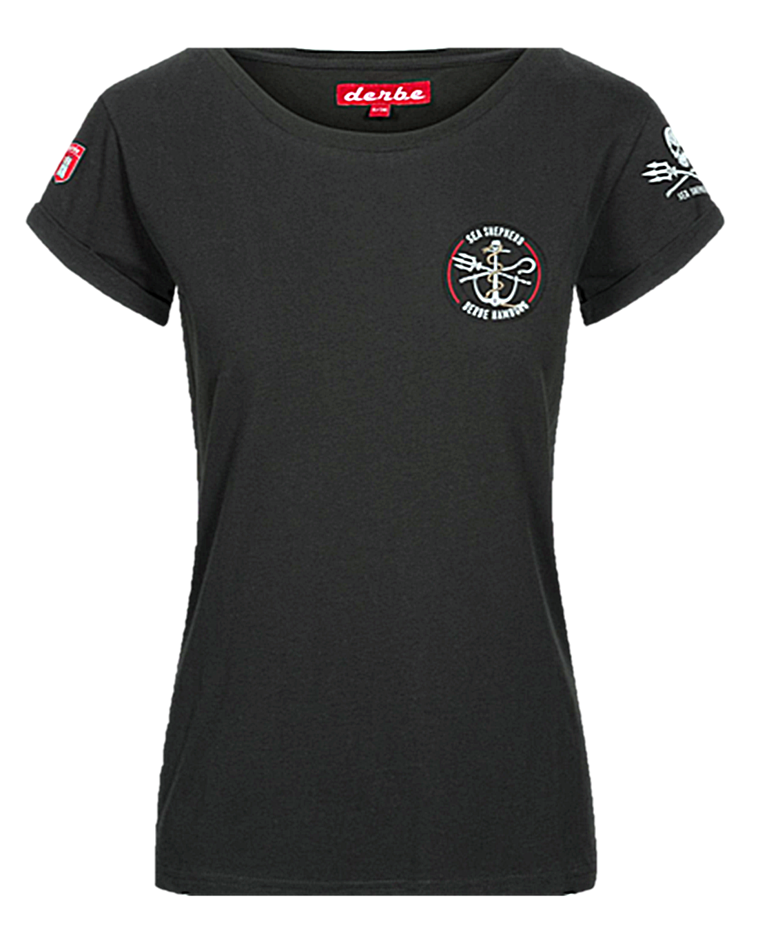 Cooles Damen Shirt von Derbe aus der neuen Derbe Sea Shepherd Kollektion. Auf dem linken Ärmel befindet sich das Sea Shepherd Logo mit Piratenkopf, auf dem rechten Ärmel das Derbe Logo. Schriftzug auf dem Rücken: Together We Protect!