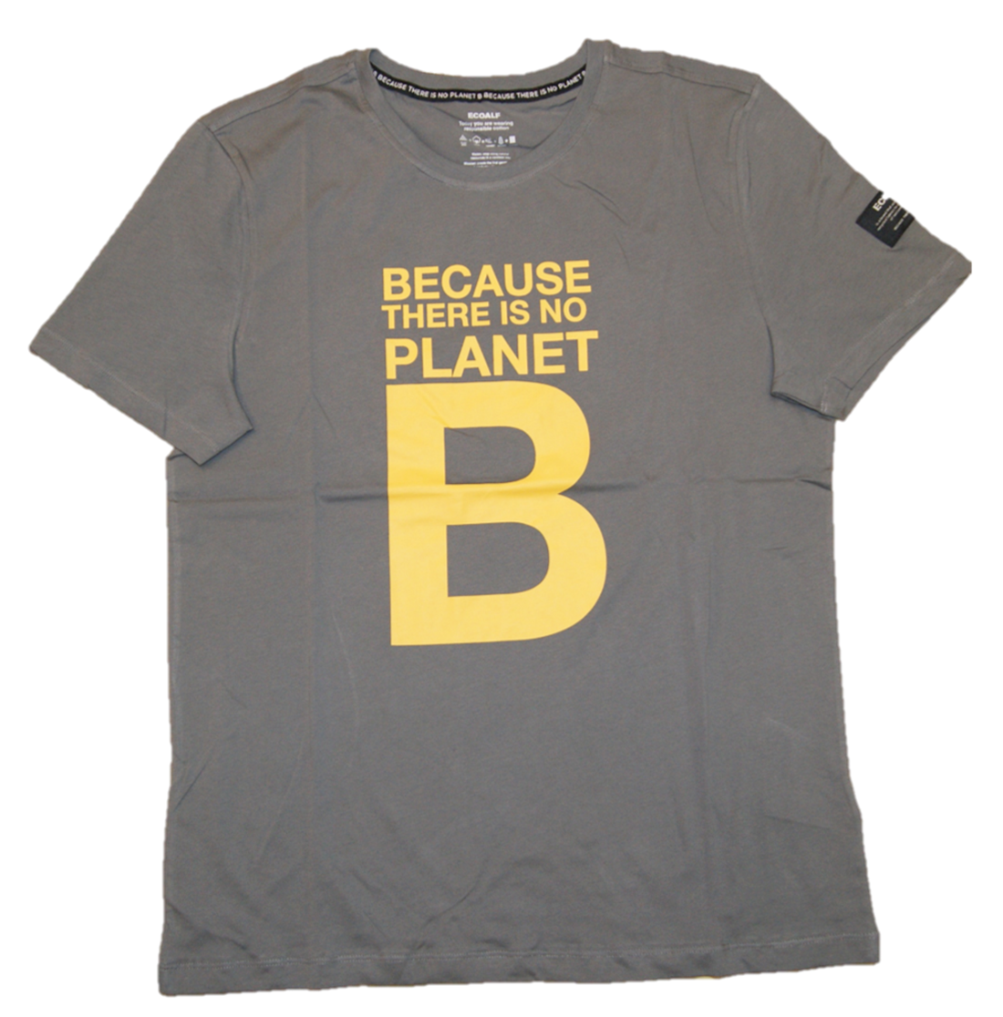 DETAILS : RUNDHALS AUSSCHNITT - STOFFBAND IM NACKEN MIT AUFDRUCK - FRONTPRINT - ECOALF LOGO LABEL AM ARM .