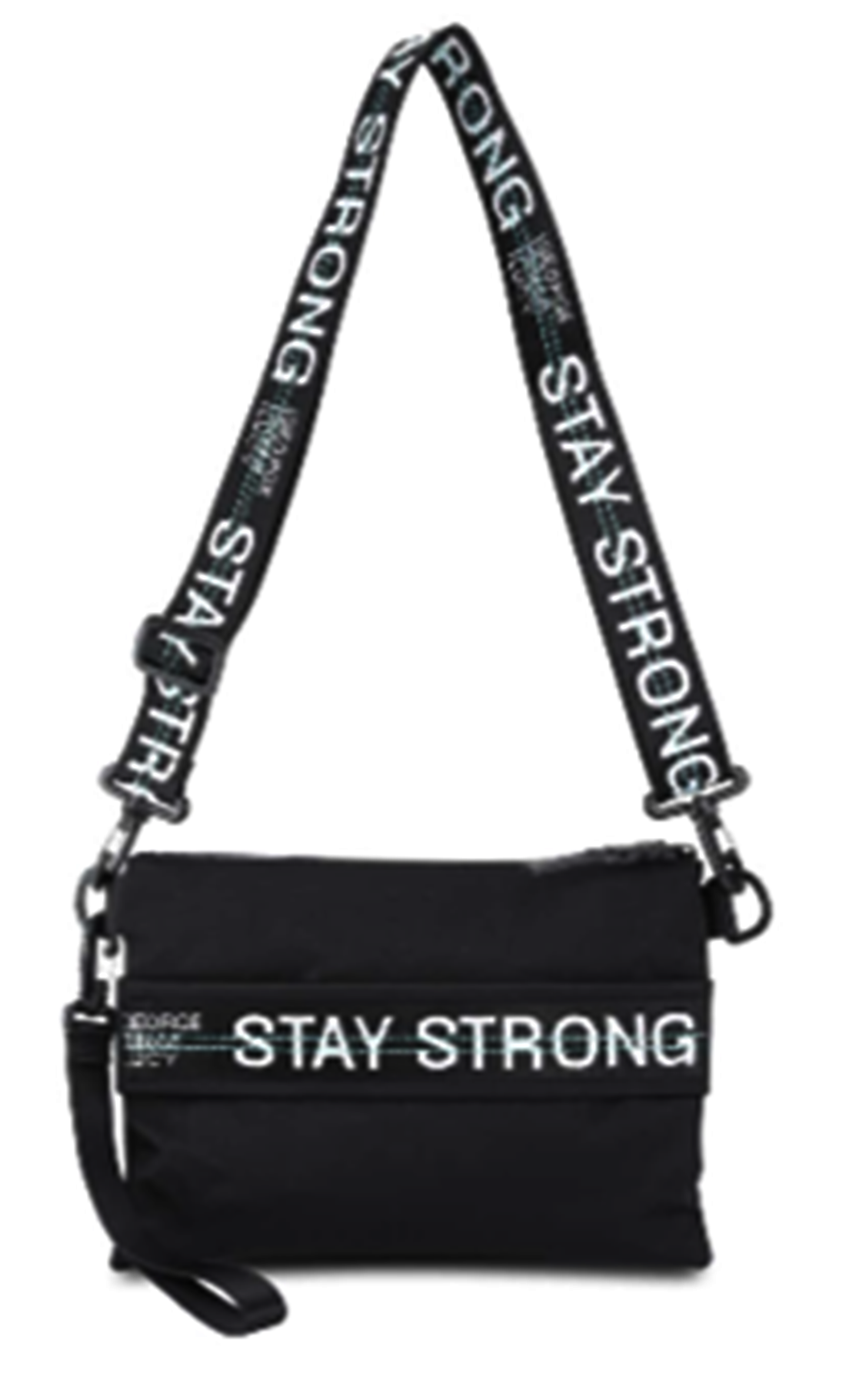 DETAILS :1 HANDSCHLAUFENGURT- VERSCHLUSS REISSVERSCHLUSS - GRÖSSENVERSTELLBARER SCHULTERGURT MIT STAY STRONG LOGO - GGL KARABINER HAKEN TONAL AM VERSCHLUSS - STAY STRONG LOGO VORNE AUF DER TASCHE .