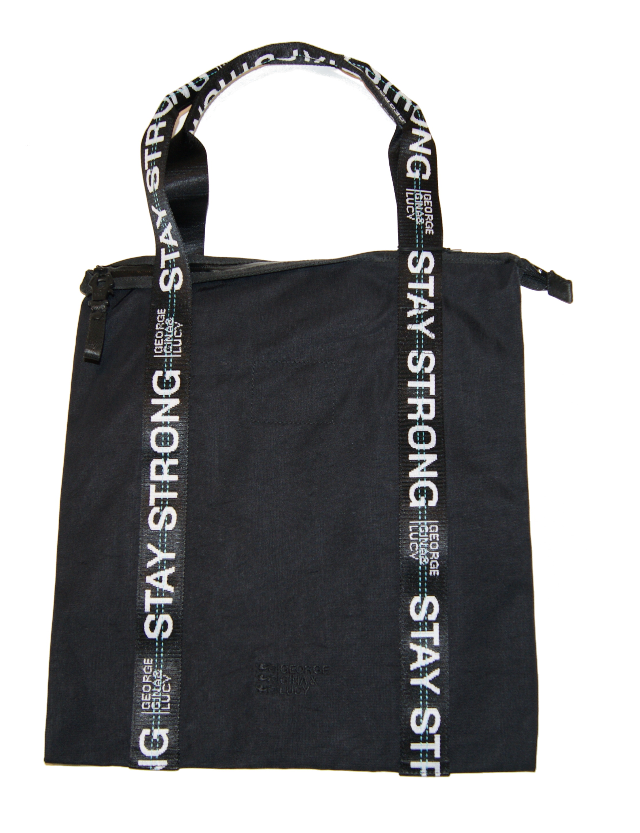 DETAILS : NYLON - ZWEI TRAGEHENKEL HENKELFALL 23 CM - HAUPTFACH VERSCHLUSS REISSVERSCHLUSS UND KARABINER HAKEN - STAY STRONG LOGO HENKEL UND ALS STREIFEN ÜBER DIE TASCHE -1 TRANSPARENTES FACH -TONALES GGL LOGO AUF DER VORDERSEITE .