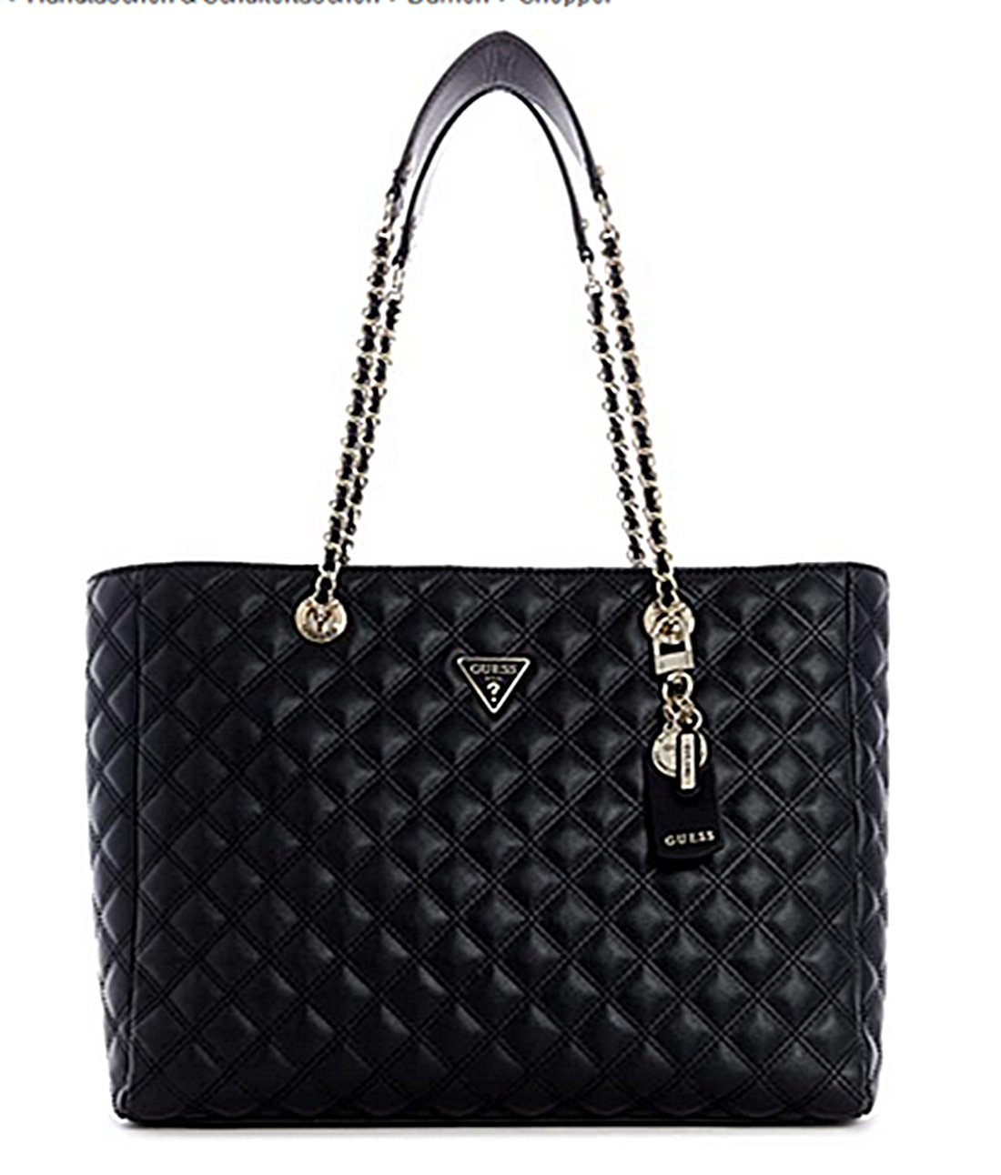 AUSSENTASCHE : VERSCHLUSS REISSVERSCHLUSS - 2 TRAGEHENKEL MIT KETTENBESATZ HENKELFALL 24 CM - GUESS LOGO VORNE- -ABNEHMBARER LOGOANHÄNGER MIT GUESS LEDERPATCH .