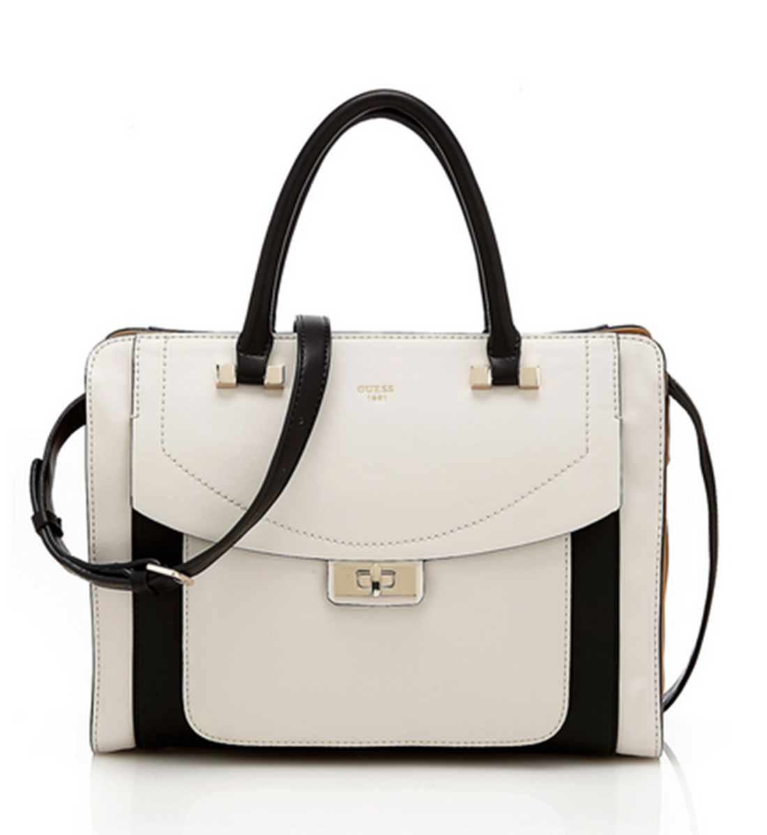 DIESE HANDTASCHE VON GUESS MIT DEM NAMEN KINGSLEY , WUNDERSCHÖNE KLASSISCHE TASCHE MIT SEPARATER FRONTTASCHE AUF DER VORDERSEITE DIE MIT DREHVERSCHLUSS VERSEHEN IST AUCH DIE COLOR BLOCK OPTIK VERLEIHT DER TASCHE EINEN MODERNEN STYLE .