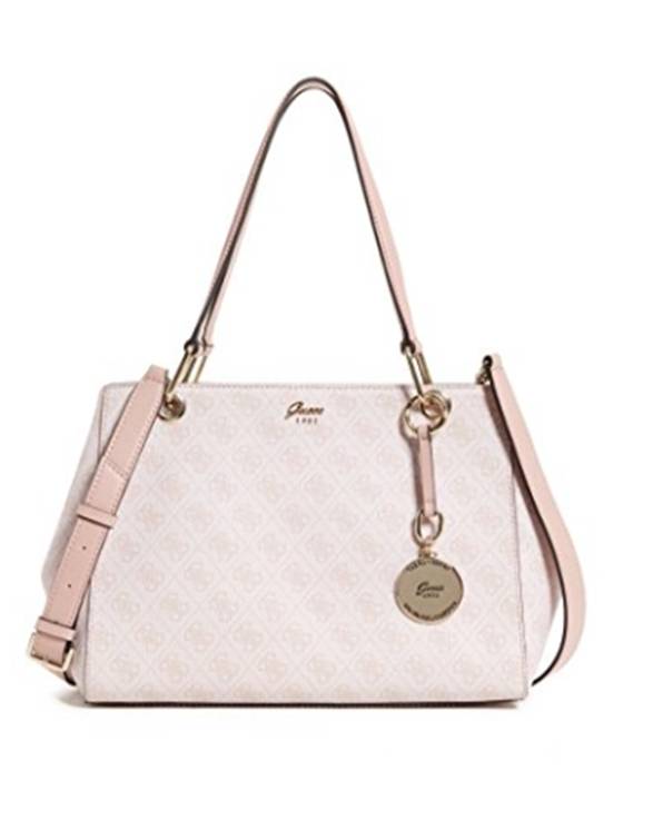 DIESE TASCHE VON GUESS MIT DEM NAMEN JAQUI HOBBO .LOGO MUSTER TASCHE MIT GOLDFARBENEN APPLIKATIONEN UND SCHMALEN TRAGE HENKEL.