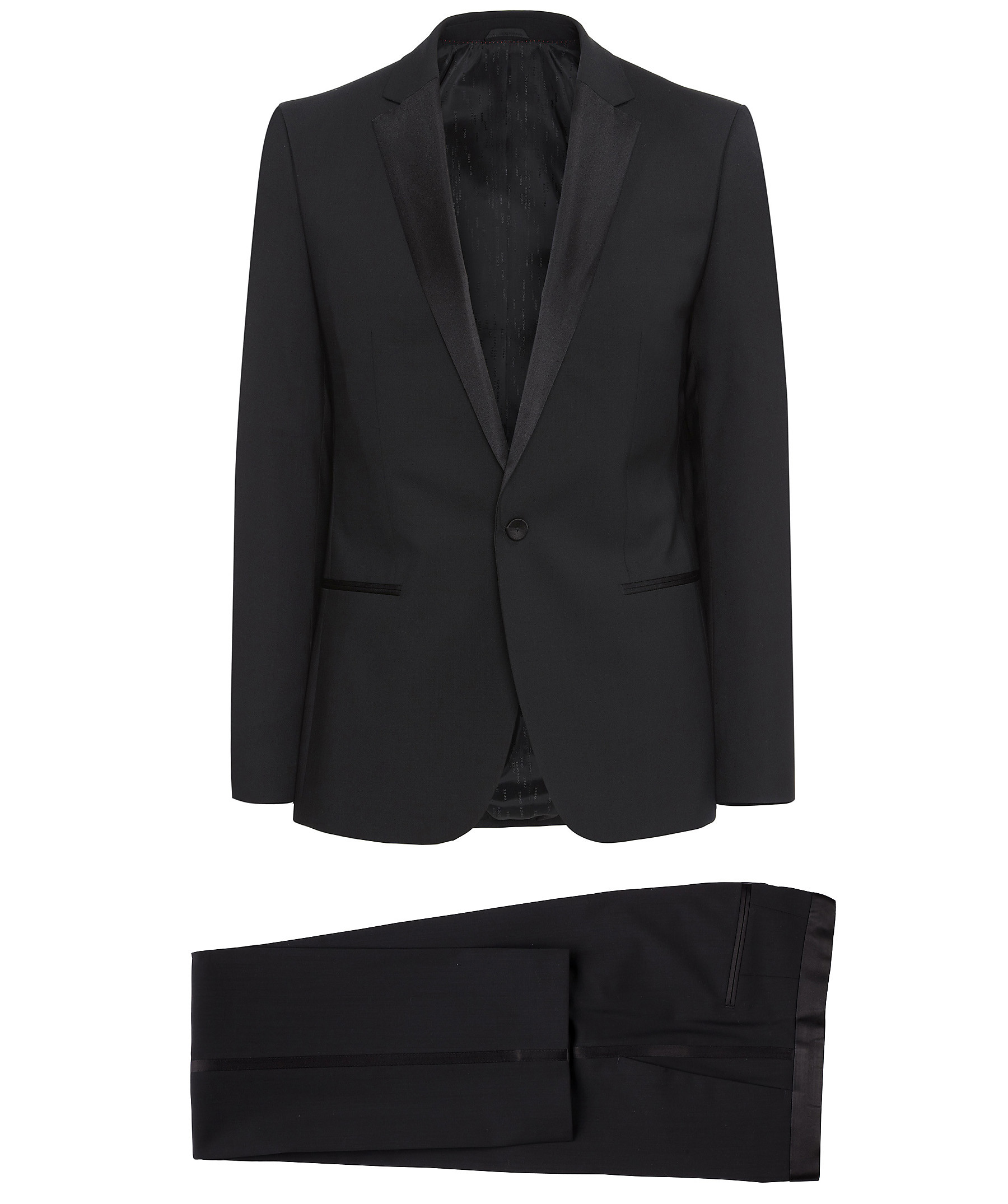 SMOKING SET MIT DEN MANEM ADEN/HIT IST AUS HOCHWERTIGE SCHURWOLLE MIT ELASTHAN ANTEIL. DER PERFEKTE ANZUG HAT GLÄNZENDE GALONSTREIFEN AN DER SMOKINGHOSE.