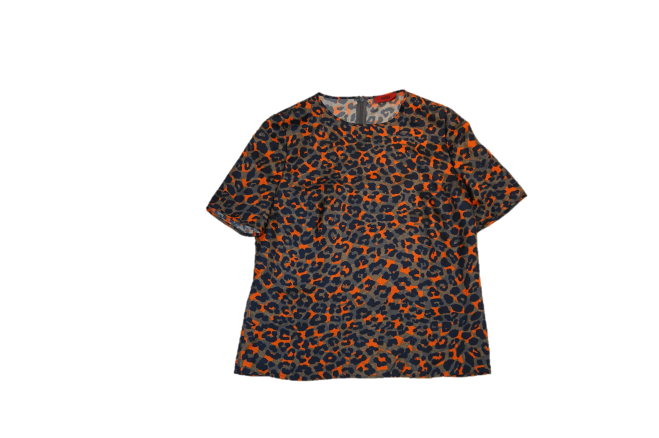 EINE ECHTE HIGHLIGHT BLUSE VON HUGO DIE FARBAKZENTE MIT DEM ORANGE BLAU GRAU TIGER MUSTER LÄSST DEN WINTER IN EINEM ANDEREN LICHT ERSCHEINEN.NÄMLICH WILD.
