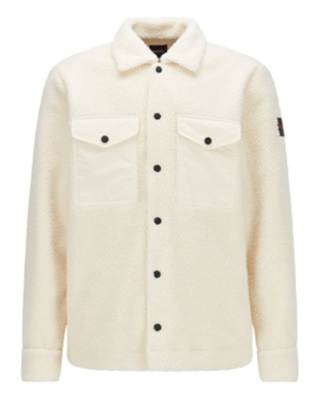 Progressives BOSS Overshirt. Lom_1. Das neu interpretierte Herren-Shirt mit lockerer Passform ist aus einem besonders soften Teddy-Kunstfell gefertigt. Gummierte Druckknöpfe und ein Logo-Aufnäher am Ärmel prägen das Design. Details aus einem Baumwoll-Mix auf der Innenseite und an den zwei Brusttaschen erzeugen einen Hybrid-Look.