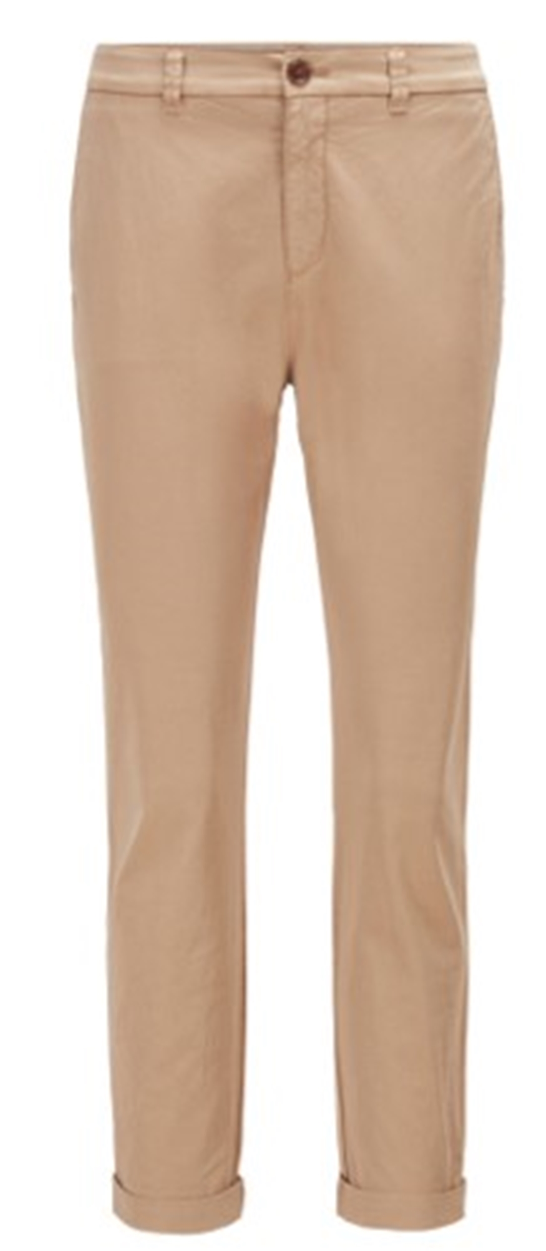 Zeitgemäße BOSS Chino mit gerader Passform und konischem Beinverlauf. Die sommerliche Damen-Hose aus elastischer Bio-Baumwolle wird für einen intensiven Farbton mit einem nachhaltigeren Prozess stückgefärbt. Für ein lässiges Finish sorgt der umgeschlagene Hosensaum.