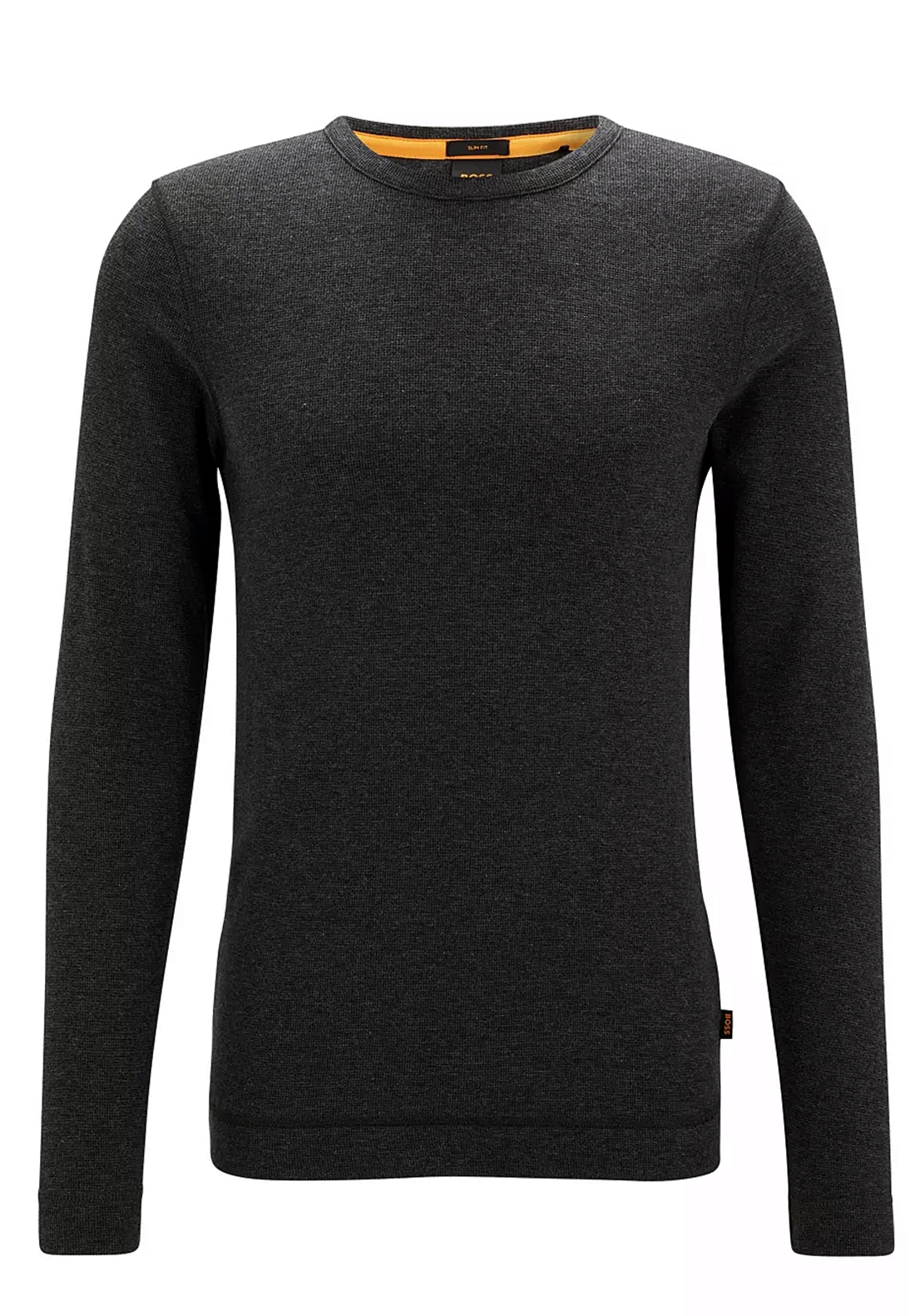 Schmal geschnittenes BOSS Longsleeve. Das Herren-Shirt ist aus reiner Baumwolle mit feiner Waffelstruktur gefertigt. Am Saum befindet sich ein melierter Logo-Aufnäher. Innen am Rundhalsausschnitt setzt ein Fischgrat-Tape ein kreatives Finish.