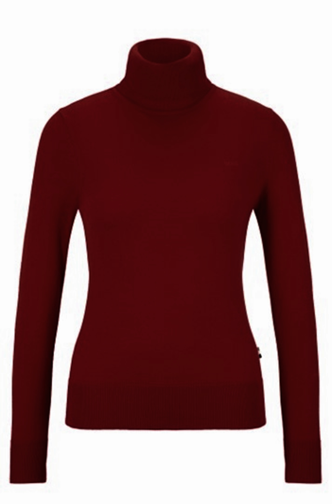 Eleganter BOSS Pullover mit Rollkragen. Der Damen-Rollkragenpullover aus einem Baumwoll-Mix mit Seiden- und Kaschmir-Anteil ist mit einem BOSS Logo auf der Brust versehen. Ein charakteristisches Streifen-Detail rundet den schmal geschnittenen Layer ab.