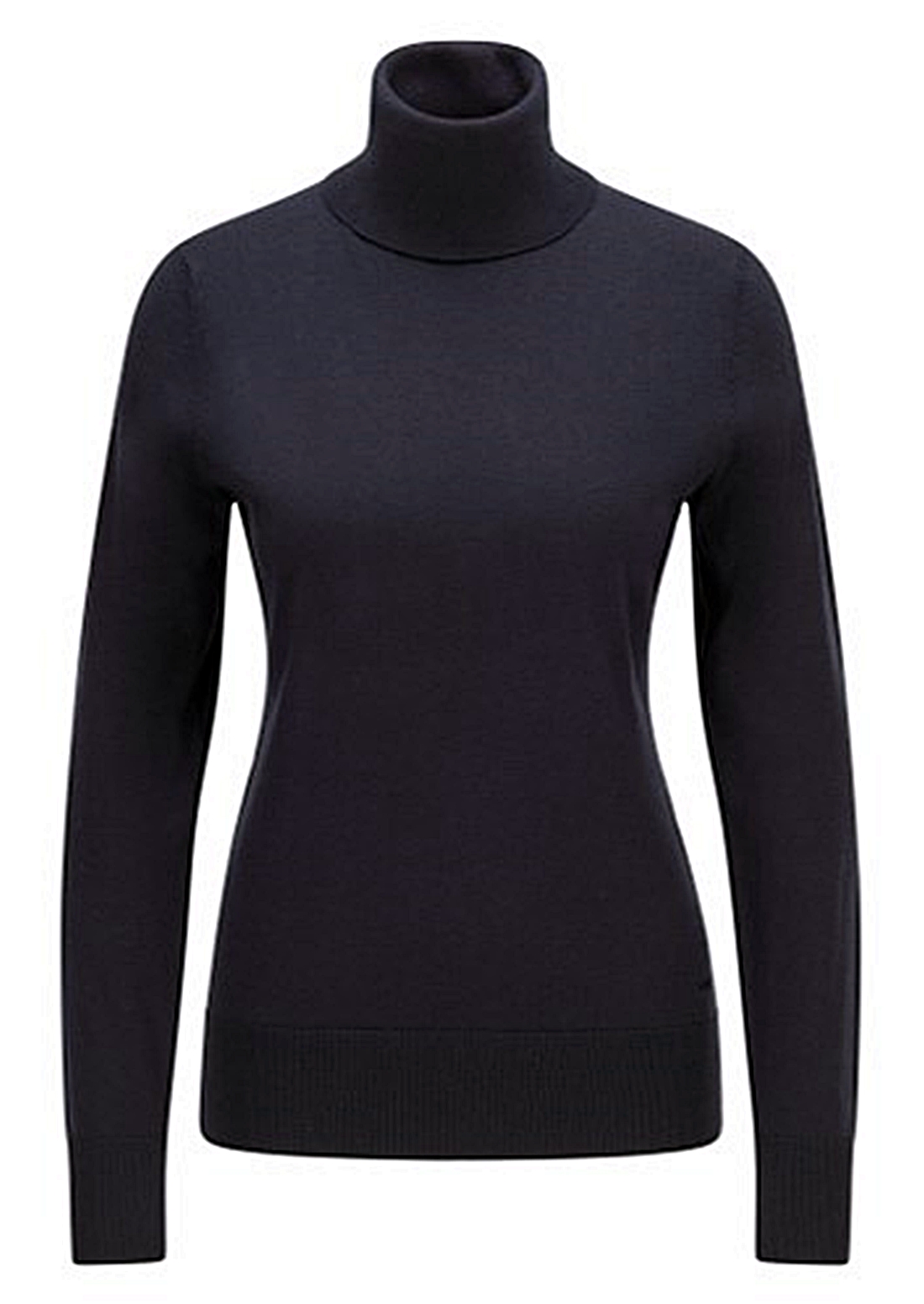 Eleganter BOSS Strickpullover aus einem edlen Baumwoll-Mix mit Seiden- und Kaschmir-Anteil. Das schmal geschnittene Damen-Top mit Rollkragen ist mit einer tonalen Logo-Stickerei am Saum versehen. Gerippte Bündchen an Kragen, Saum und Ärmeln verleihen dem leichten Style mehr Struktur und Komfort.