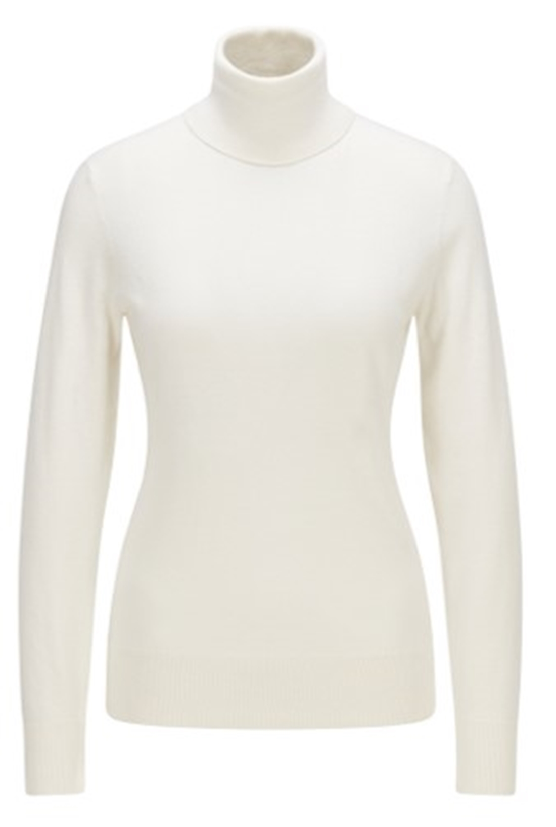 leganter BOSS Strickpullover aus einem edlen Baumwoll-Mix mit Seiden- und Kaschmir-Anteil. Das schmal geschnittene Damen-Top mit Rollkragen ist mit einer tonalen Logo-Stickerei am Saum versehen. Gerippte Bündchen an Kragen, Saum und Ärmeln verleihen dem leichten Style mehr Struktur und Komfort.
