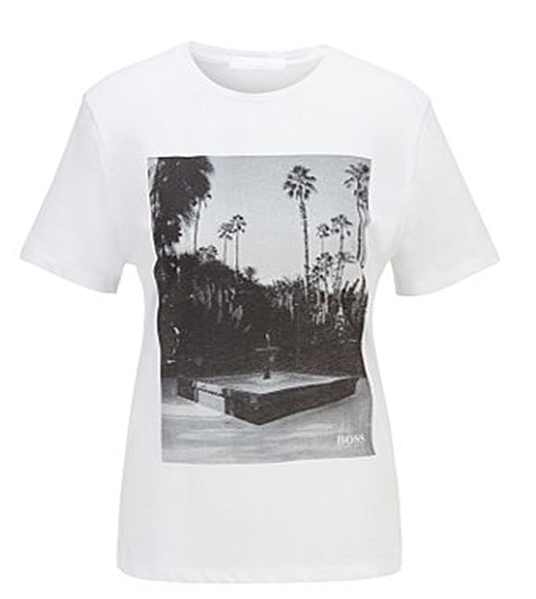 Charakteristisches BOSS T-Shirt aus besonders softem Jersey aus zertifizierter Bio-Baumwolle. Das legere Damen-Shirt mit Rundhalsausschnitt ist auf der Vorderseite mit einem großen Foto Print mit integriertem BOSS Logo bedruckt. Die gerade Passform verleiht dem Casual-Shirt eine entspannte Silhouette. Bei der Herstellung und Fertigung unserer Produkte sind wir immer auf der Suche nach nachhaltigeren Lösungen.