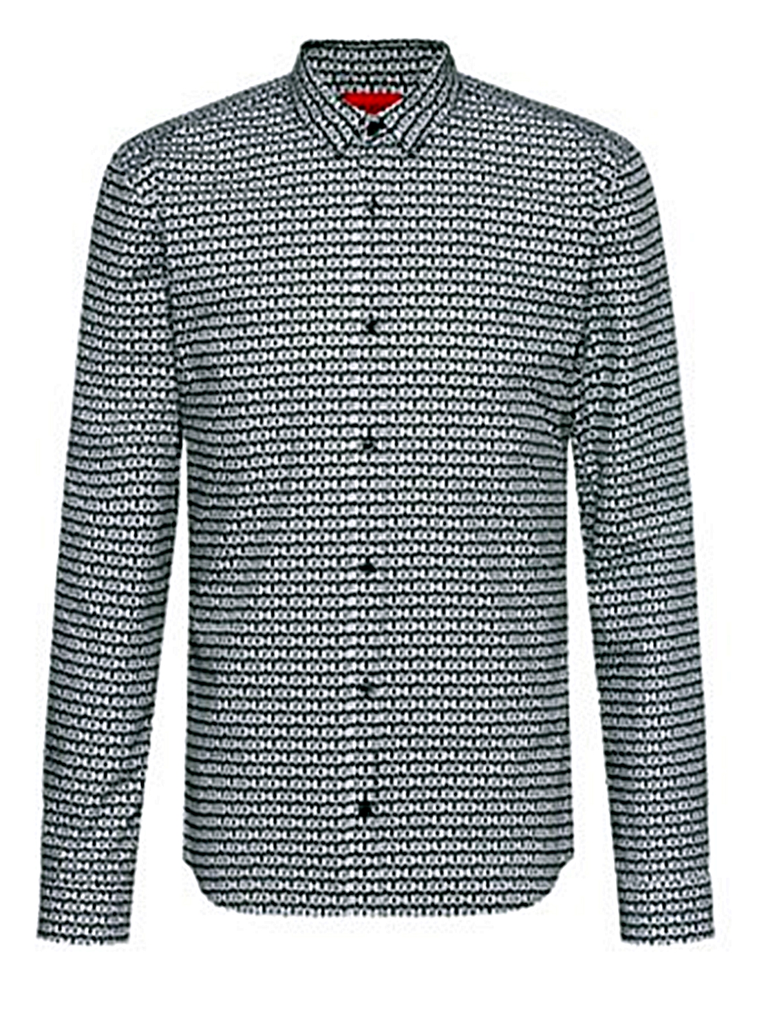 Progressives HUGO Hemd mit extra schmaler Passform. Das Herren-Hemd aus reiner Baumwoll-Popeline ist durchgehend mit den neuen Reifenprofil-Logos bedruckt. Das frische HUGO Logo ist ein exklusives Design des japanisch-brasilianischen Tattoo-Künstlers Jun Matsui.