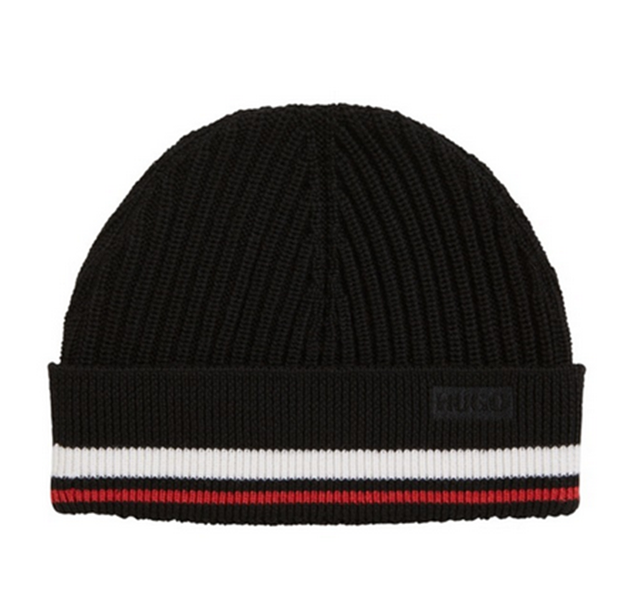 HUGO Gerippte Mütze XIANNO aus Merinowolle mit Streifen-Detail Farbe schwarz 002
