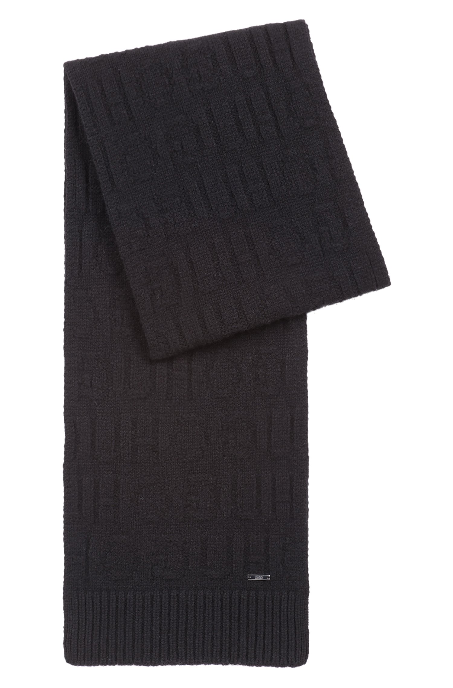 DETAILS : SCHAL : SCHAL MIT JAQUARD STRICKMUSTER - STRICKBUND - HUGO LOGO METALL LABEL ÜBER DEM BUND- MASSE : 170 CM X 24 CM
