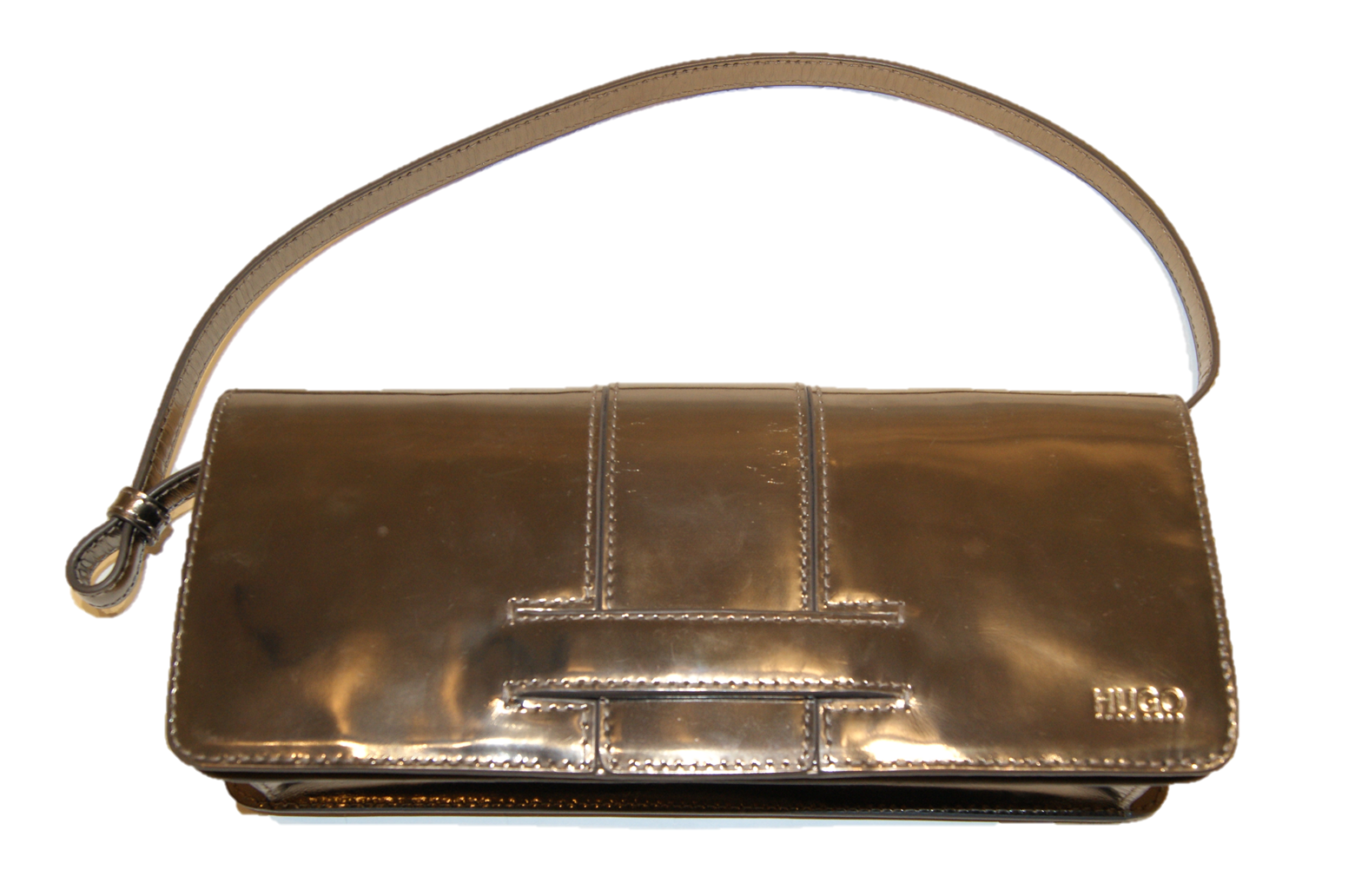 DIESE TASCHE MIT DEM NAMEN MINERVA VON HUGO EINE SILBERNE CLUTCH MIT LANGEN GURT FÜR SCHULTER ODER HANDGELENK .