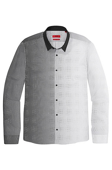 DIESES HEMD VON HUGO MIT DEM NAMEN ERO3 TV MIT SCHMALEM KENTKRAGEN IN KONTRASTFARBE. DAS MARKANTE, GEMUSTERTE DESSIN ÜBERZEUGT DURCH DEN FARBVERLAUF UND DEN KONTRASTFARBENEN KNÖPFEN ZUM COOLEN EYECATCHER.