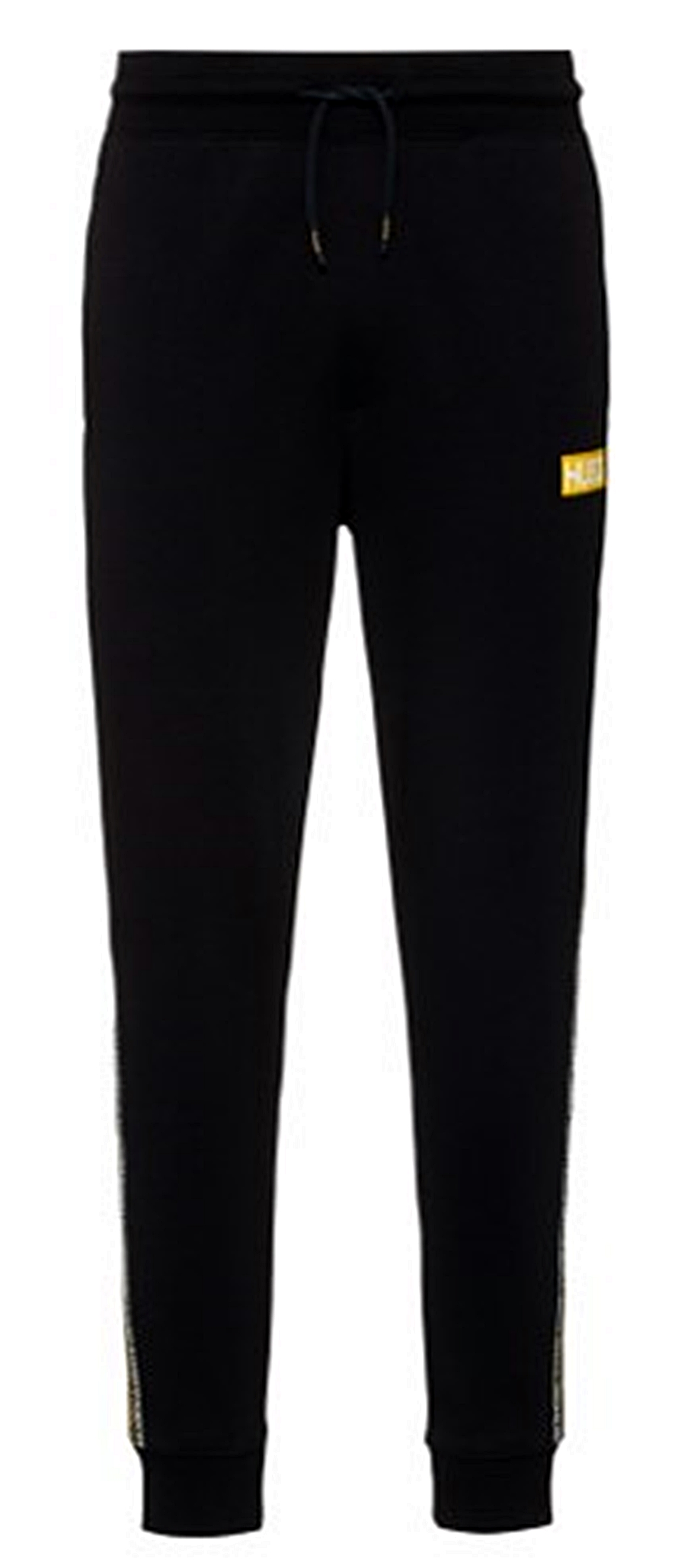Vielseitig kombinierbare HUGO Jogginghose mit gerader Passform und Beinbündchen. Die Herren-Hose aus Baumwoll-Terry ist mit einem Logo in Reifenspuren-Optik am linken Bein versehen, das sich an den Seitennähten wiederholt. Gebrandete Kordelenden runden das sportive Basic ab.