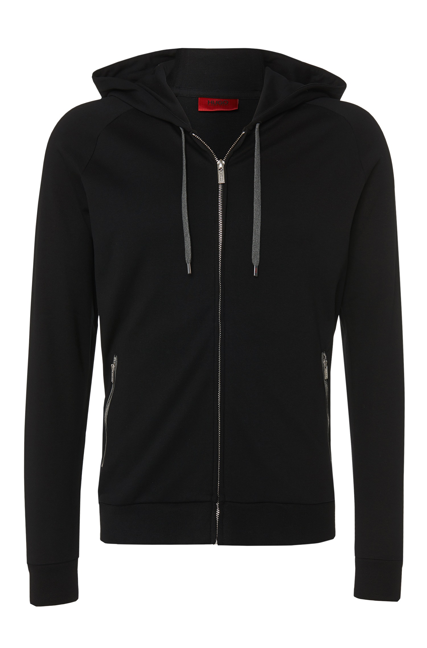 DETAILS: HOCHWERTIGE BAUMWOLLE- KAPUZE MIT KORDELZUG IN GRAU - DURCHGEHENDER SILBERNER REISSVERSCHLUSS- 2 REISSVERSCHLUSSTASCHEN IN GRAU UNTERLEGT -HUGO LOGO TONAL  AM SAUM LINKS.